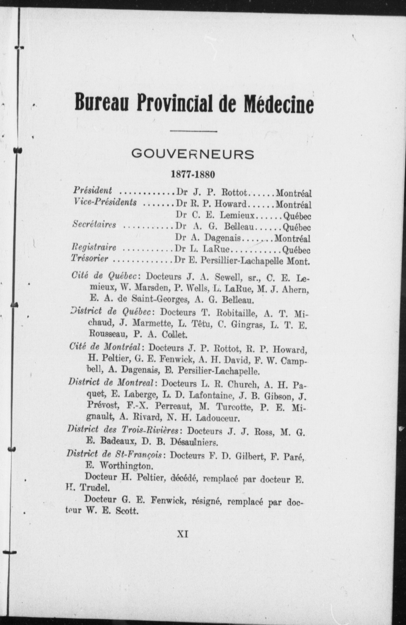 Le Collège des Médecins et Chirurgiens de la Province de Québec :