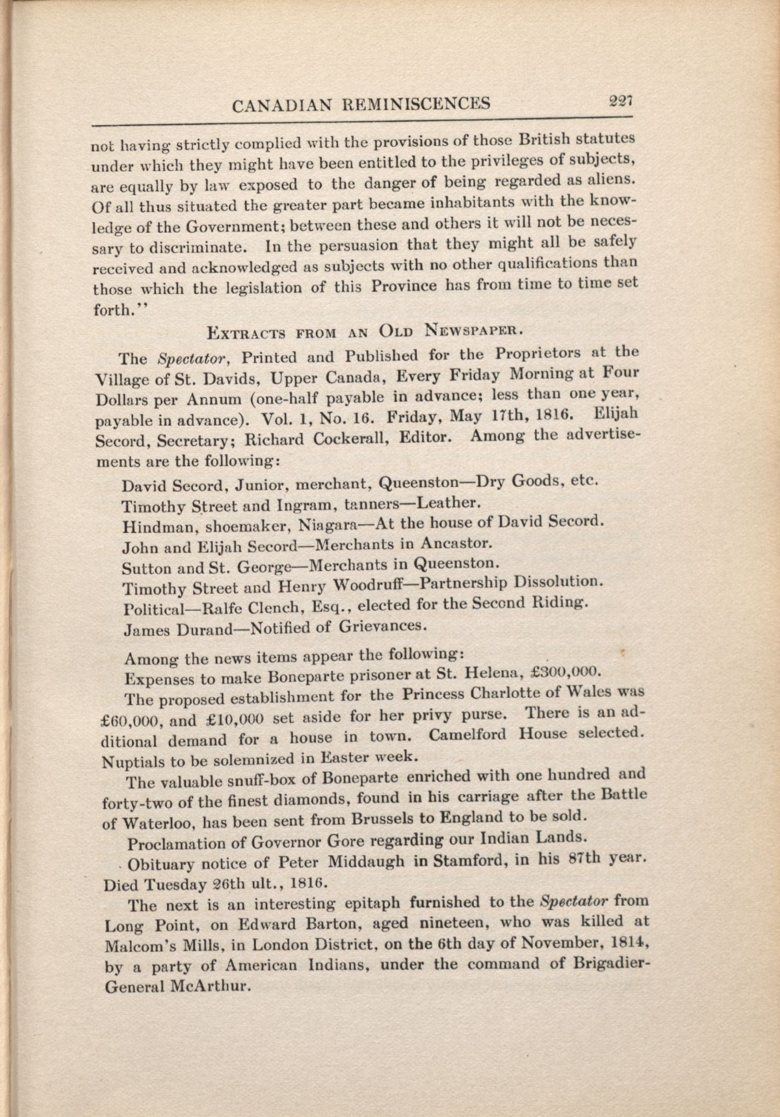 Laura Ingersoll Secord and Canadian reminiscences