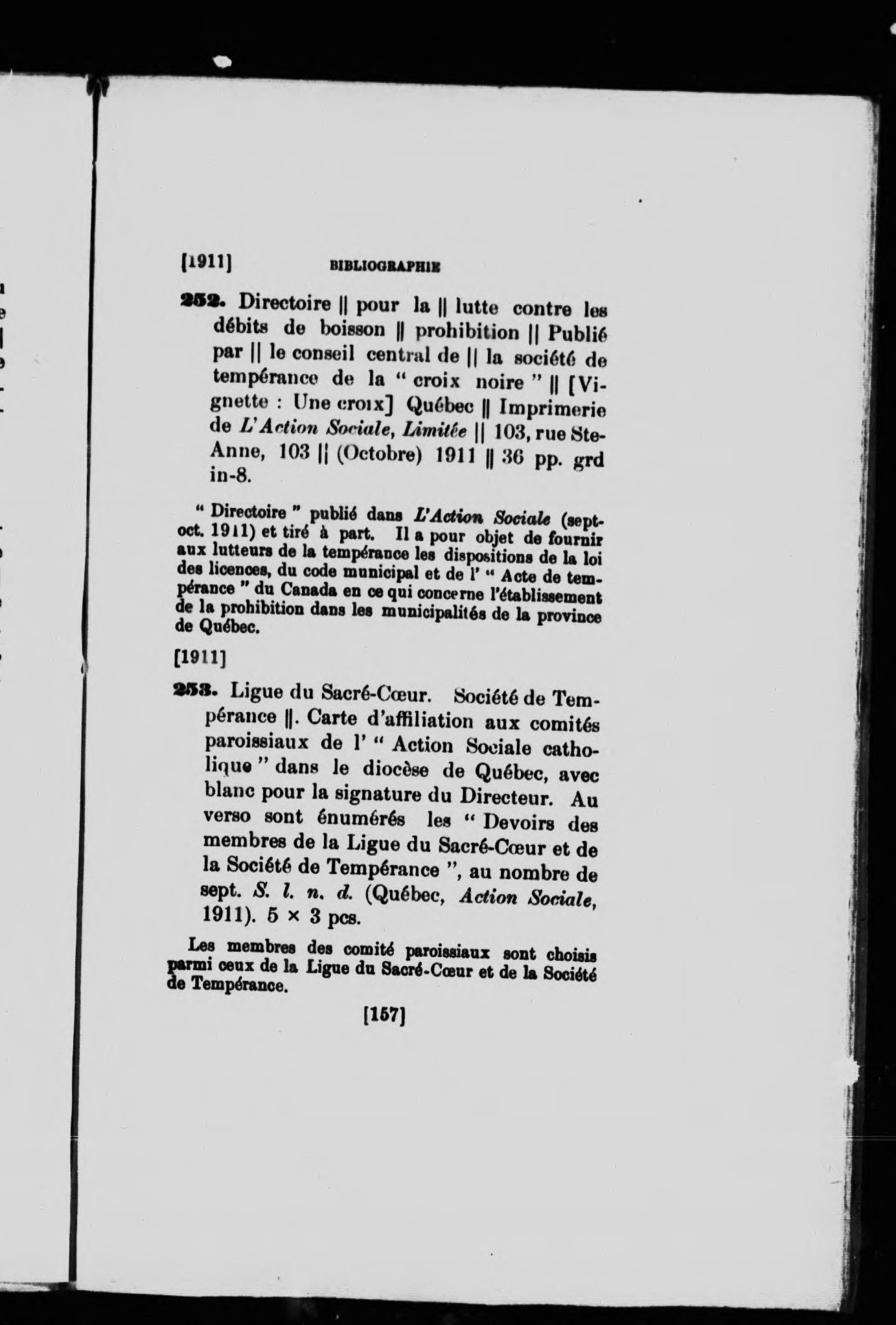- Bibliographie des ouvrages concernant la tempérance : livres, brochures, journaux, revues, feuilles, cartes, etc., imprimés à Québec et à Lévis depuis l'établissement de l'imprimerie (1764) jusqu'à 1910