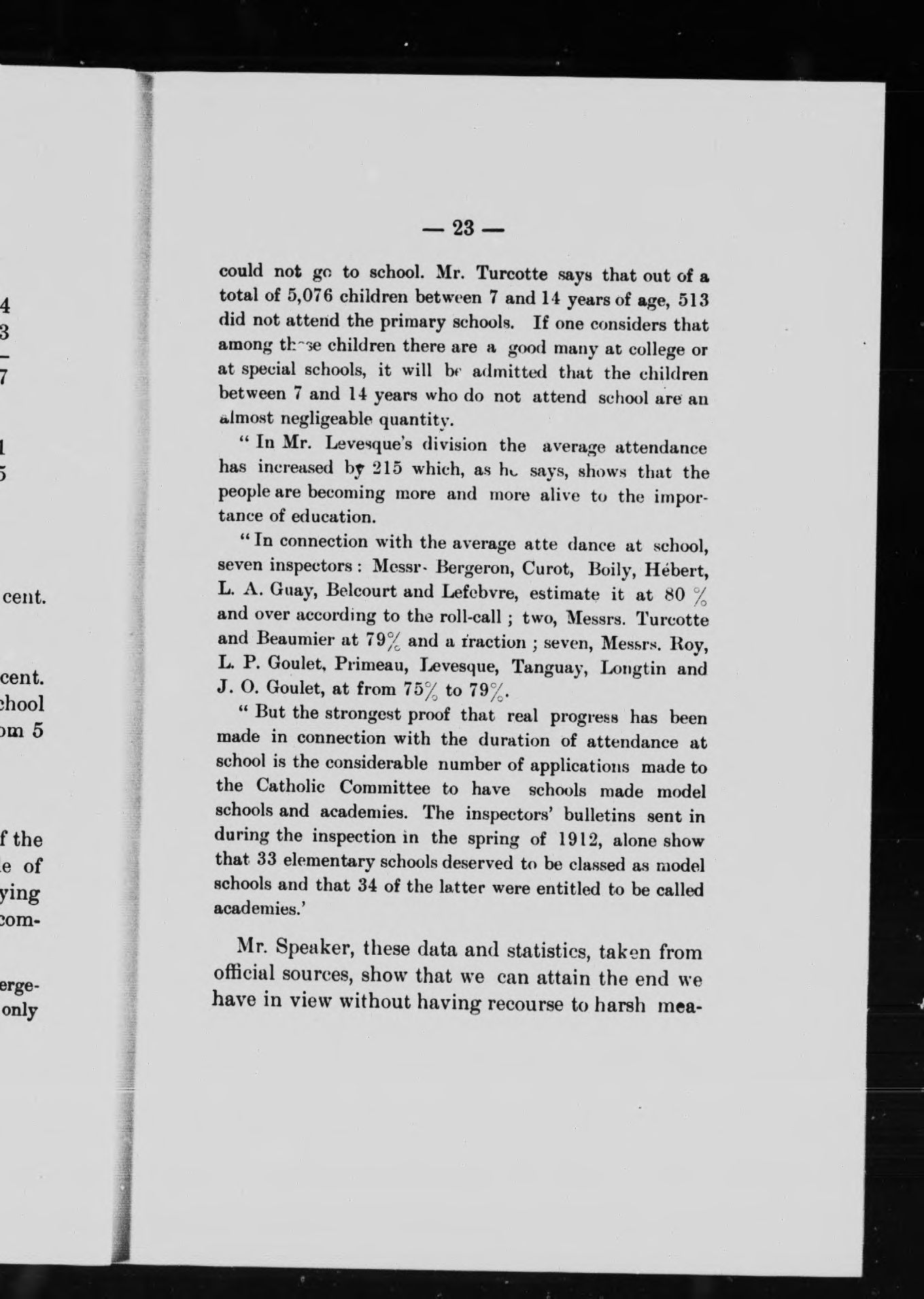 Summary of a speech made by Honorable Sir Lomer Gouin, K.C.M.G., in the Quebec Legislative Assembly on the 26th November, 1912 : during a debate on the bill respecting Compulsory School Attendance among Protestants.