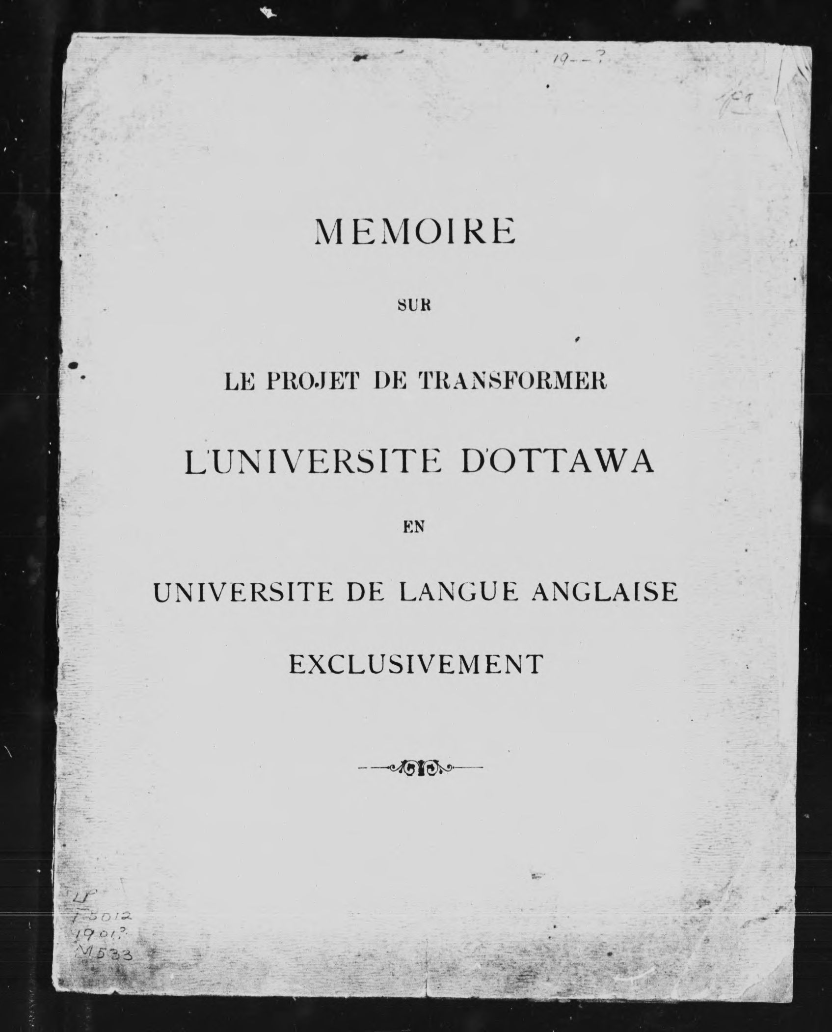 Mémoire sur le projet de transformer l'Université d'Ottawa en université de langue anglaise exclusivement.