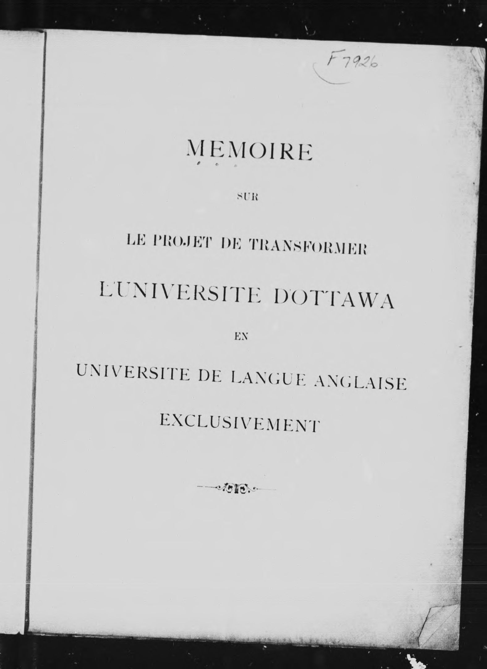 Mémoire sur le projet de transformer l'Université d'Ottawa en université de langue anglaise exclusivement.