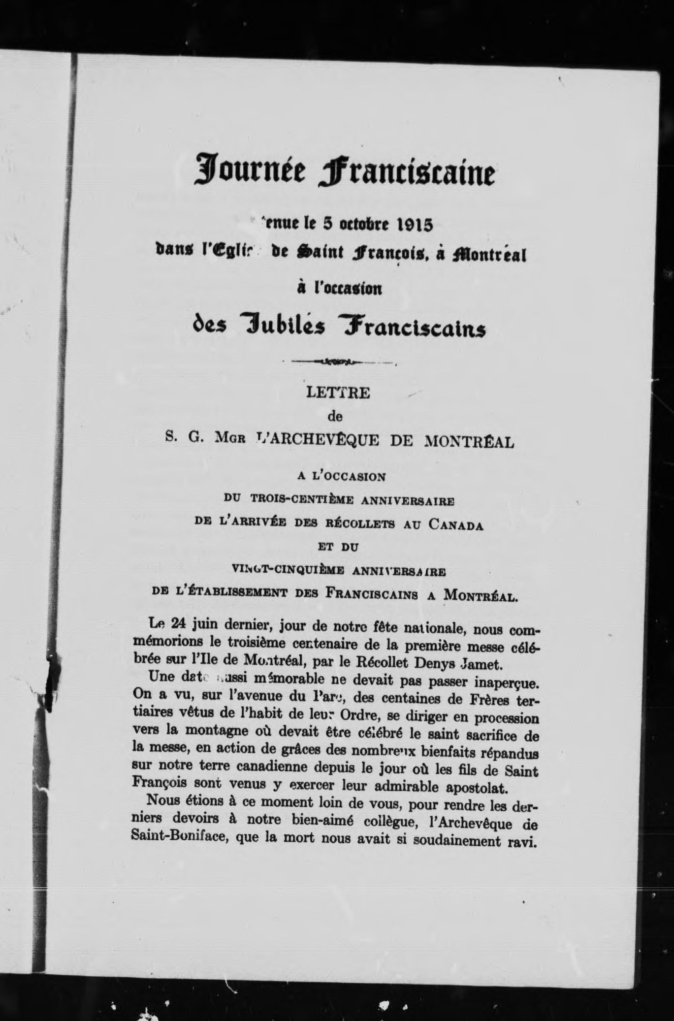 Journée franciscaine : tenue le 5 octobre 1915 dans l'église de Saint François, à Montréal, à l'occasion des jubilés franciscains. - Adresse bibliographique