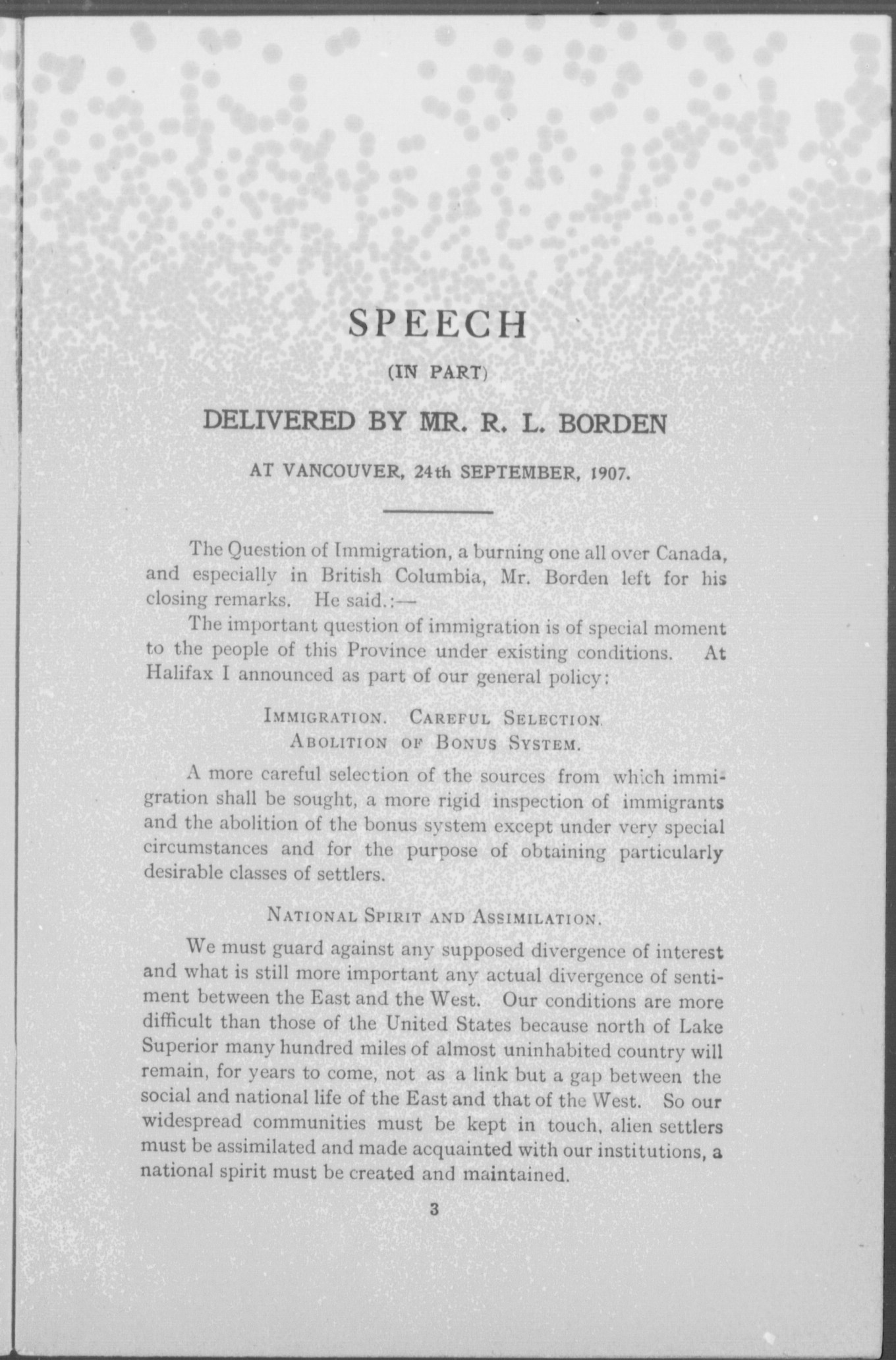 Pages 3-9: Speech (in part) delivered by Mr. R.L. Borden at Vancouver, 24th September, 1907.