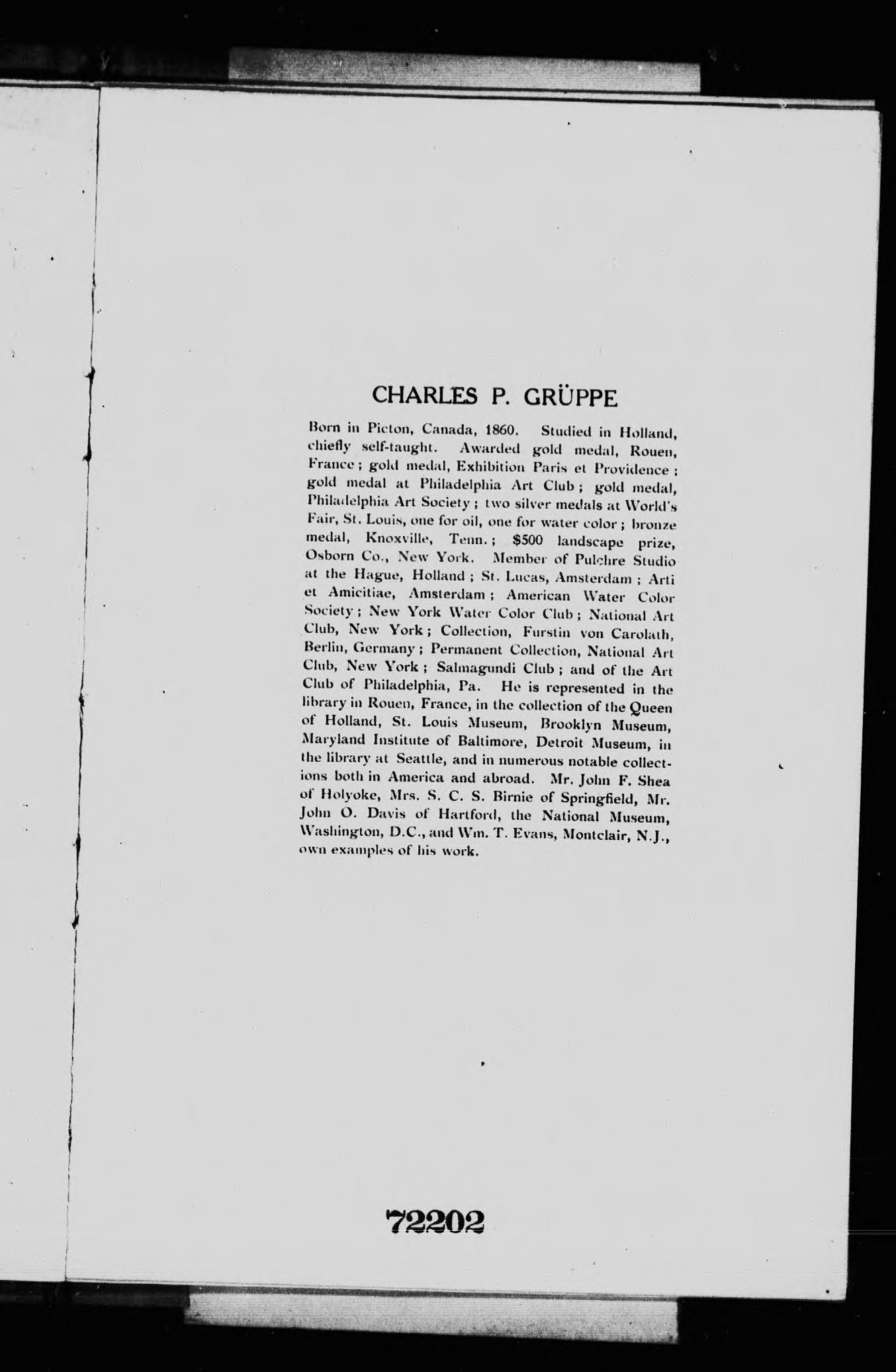 Catalogue of an exhibition of paintings by Charles P. Grüppe of New York : to be held in the Galleries of the Art Association of Montreal, December 27th, 1913 to January 17th, 1914.