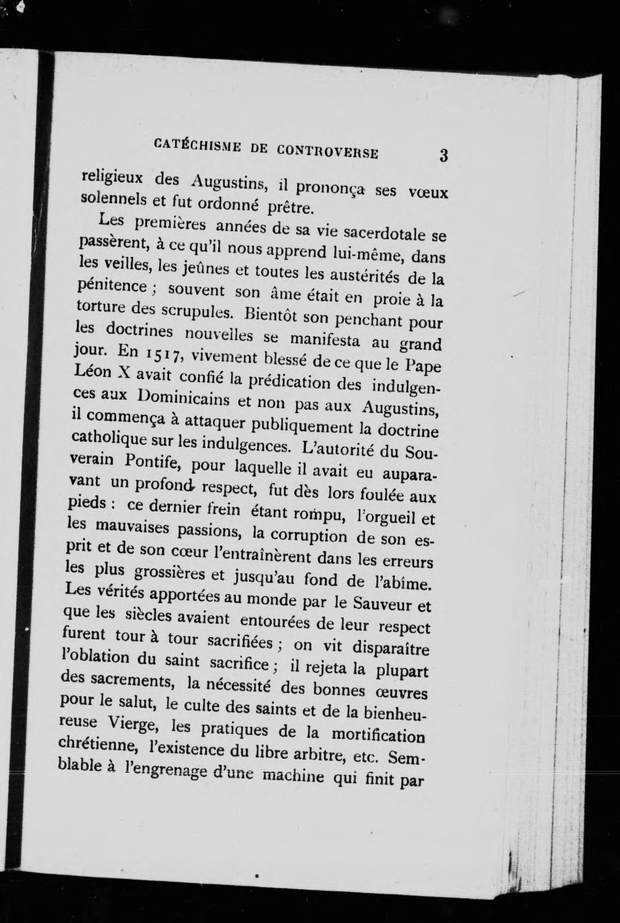 "Première Partie. I. Origines du protestantisme. II. L'Église, les Papes et la société civil. III. La Bible et la Tradition. IV. Prétendue intolérance de l'Église."