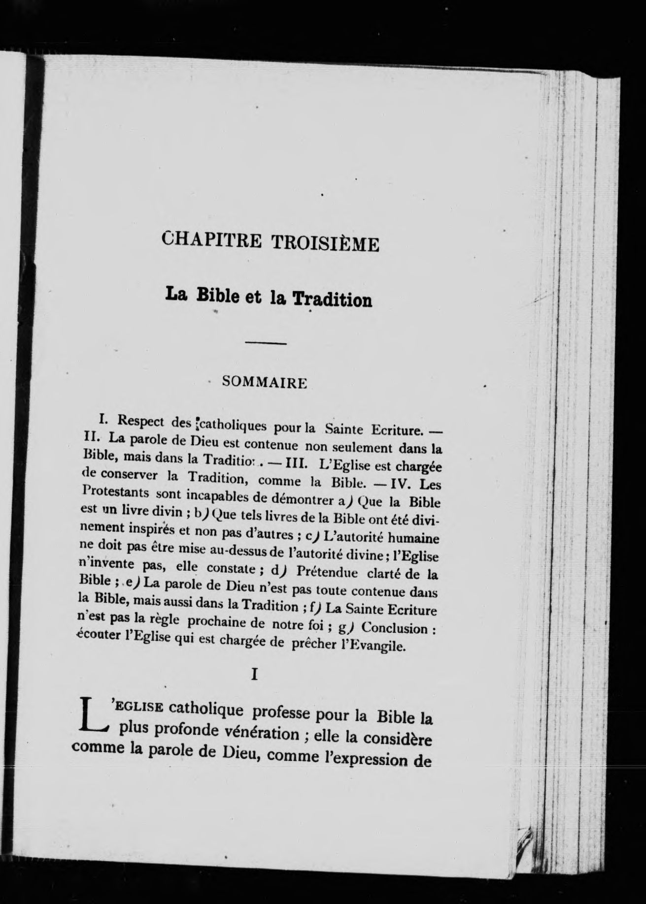 "Première Partie. I. Origines du protestantisme. II. L'Église, les Papes et la société civil. III. La Bible et la Tradition. IV. Prétendue intolérance de l'Église."