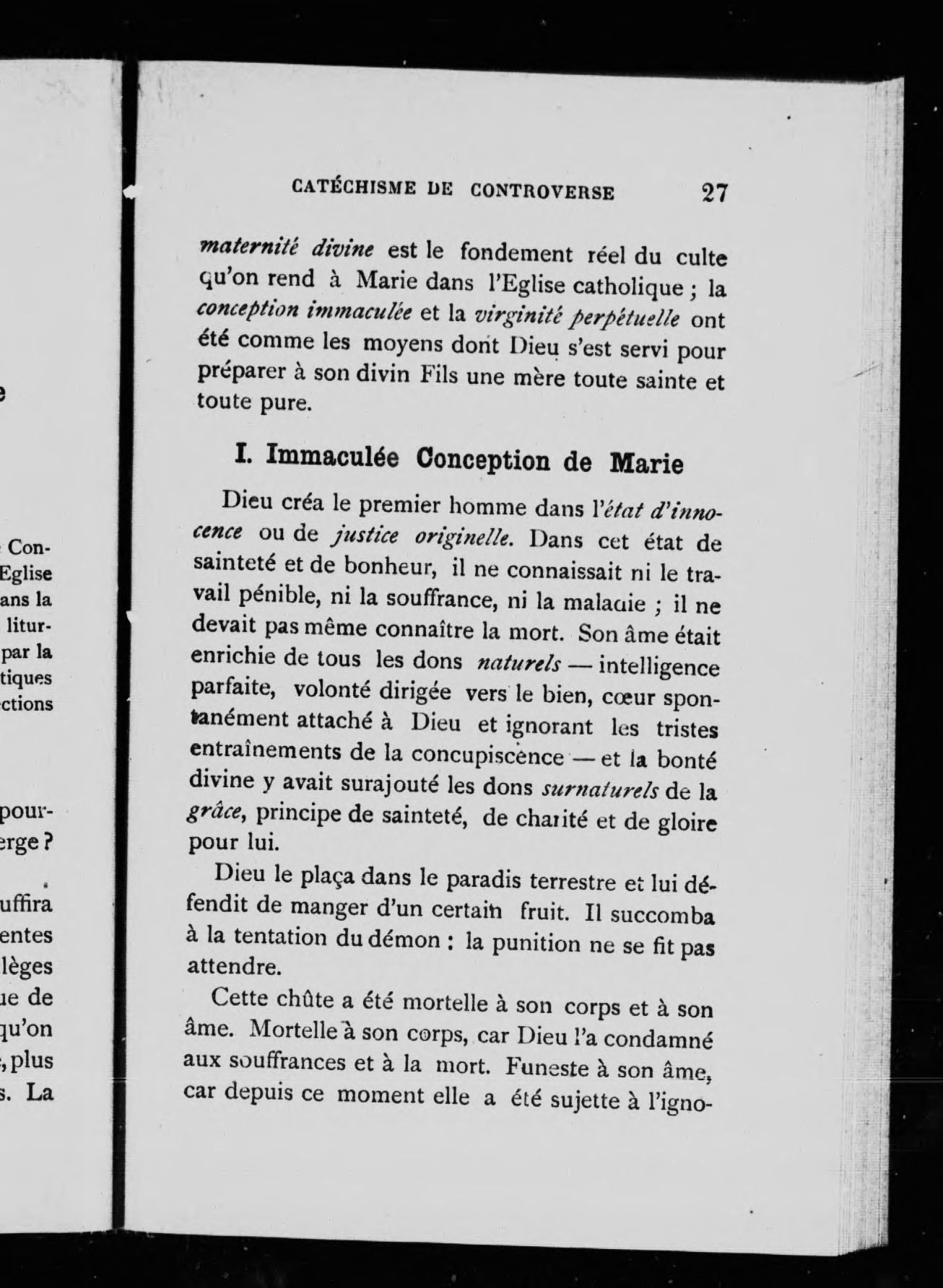 "Troisième Partie. I. Le culte des saints et des reliques. II. Le culte de la Très Sainte Vierge : Immaculée Conception, Virginité perpétuelle ; Maternité divine de Marie. III. Le culte des images - Les pélerinages. IV. Les particularités du culte extérieur dans l'Église catholique: l'encens, les lampes, l'eau bénite, les cérémonies en général. V. Le Purgatoire. VI. Les Indulgences."