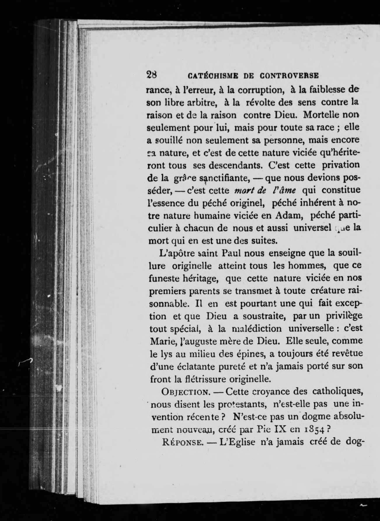 "Troisième Partie. I. Le culte des saints et des reliques. II. Le culte de la Très Sainte Vierge : Immaculée Conception, Virginité perpétuelle ; Maternité divine de Marie. III. Le culte des images - Les pélerinages. IV. Les particularités du culte extérieur dans l'Église catholique: l'encens, les lampes, l'eau bénite, les cérémonies en général. V. Le Purgatoire. VI. Les Indulgences."