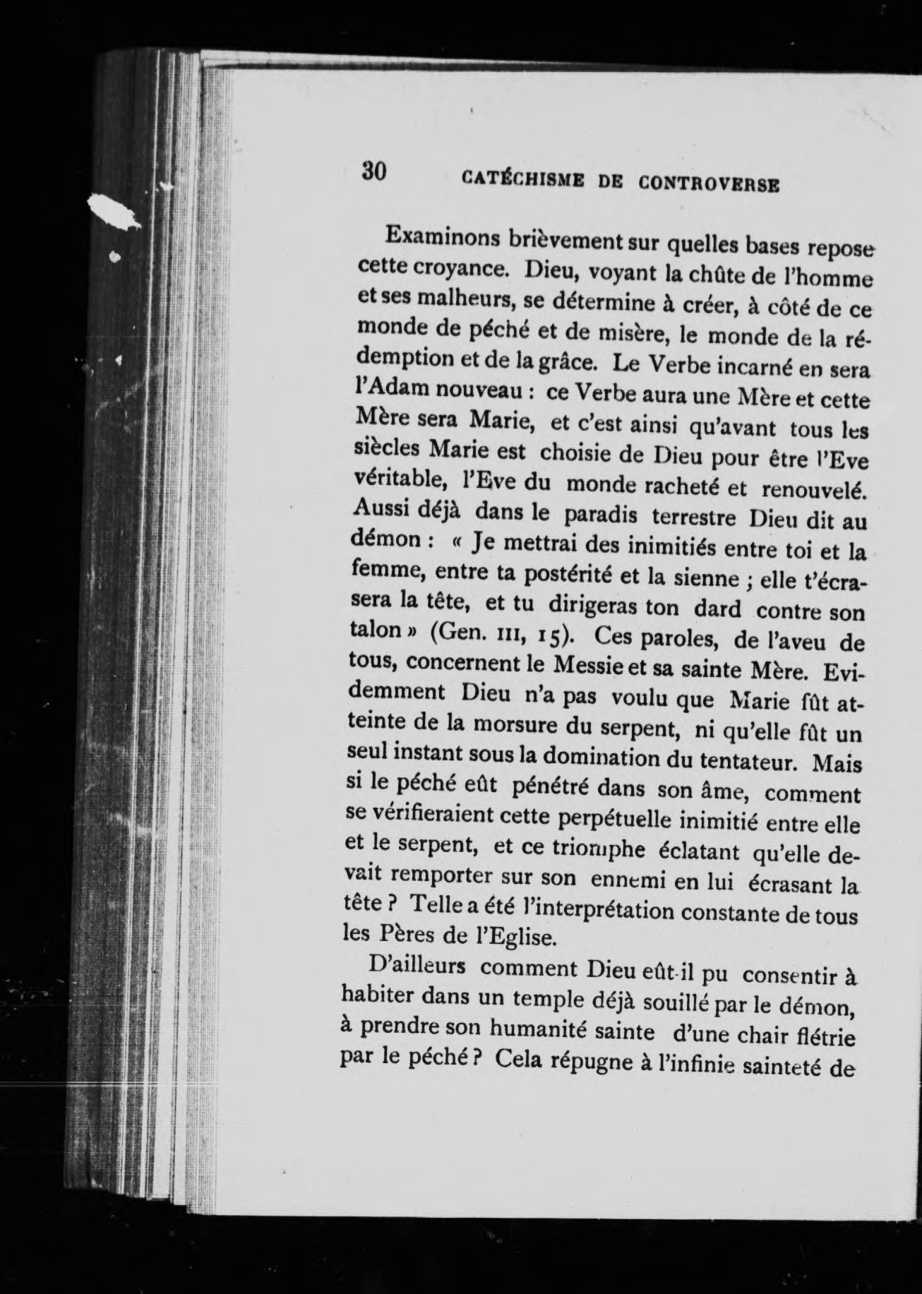 "Troisième Partie. I. Le culte des saints et des reliques. II. Le culte de la Très Sainte Vierge : Immaculée Conception, Virginité perpétuelle ; Maternité divine de Marie. III. Le culte des images - Les pélerinages. IV. Les particularités du culte extérieur dans l'Église catholique: l'encens, les lampes, l'eau bénite, les cérémonies en général. V. Le Purgatoire. VI. Les Indulgences."