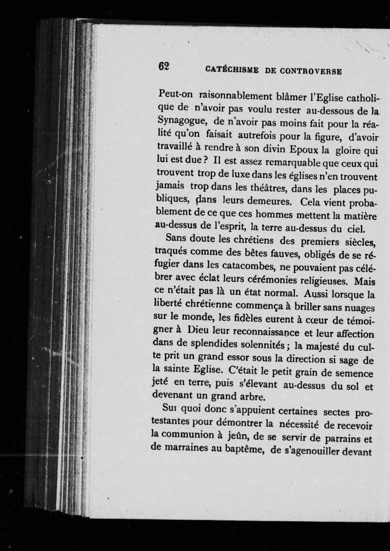 "Troisième Partie. I. Le culte des saints et des reliques. II. Le culte de la Très Sainte Vierge : Immaculée Conception, Virginité perpétuelle ; Maternité divine de Marie. III. Le culte des images - Les pélerinages. IV. Les particularités du culte extérieur dans l'Église catholique: l'encens, les lampes, l'eau bénite, les cérémonies en général. V. Le Purgatoire. VI. Les Indulgences."
