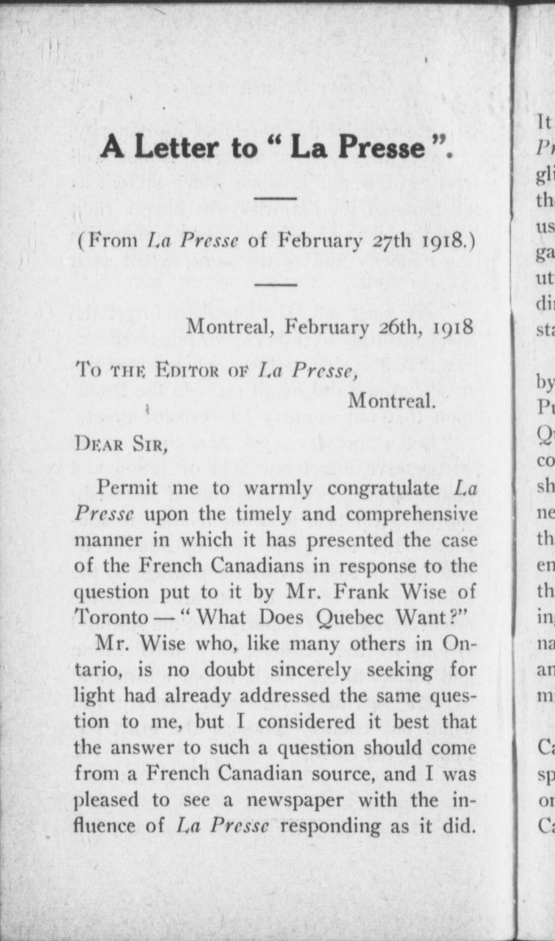 - What Quebec wants : reply of La Presse to a question from Ontario : for the English speaking people of the dominion