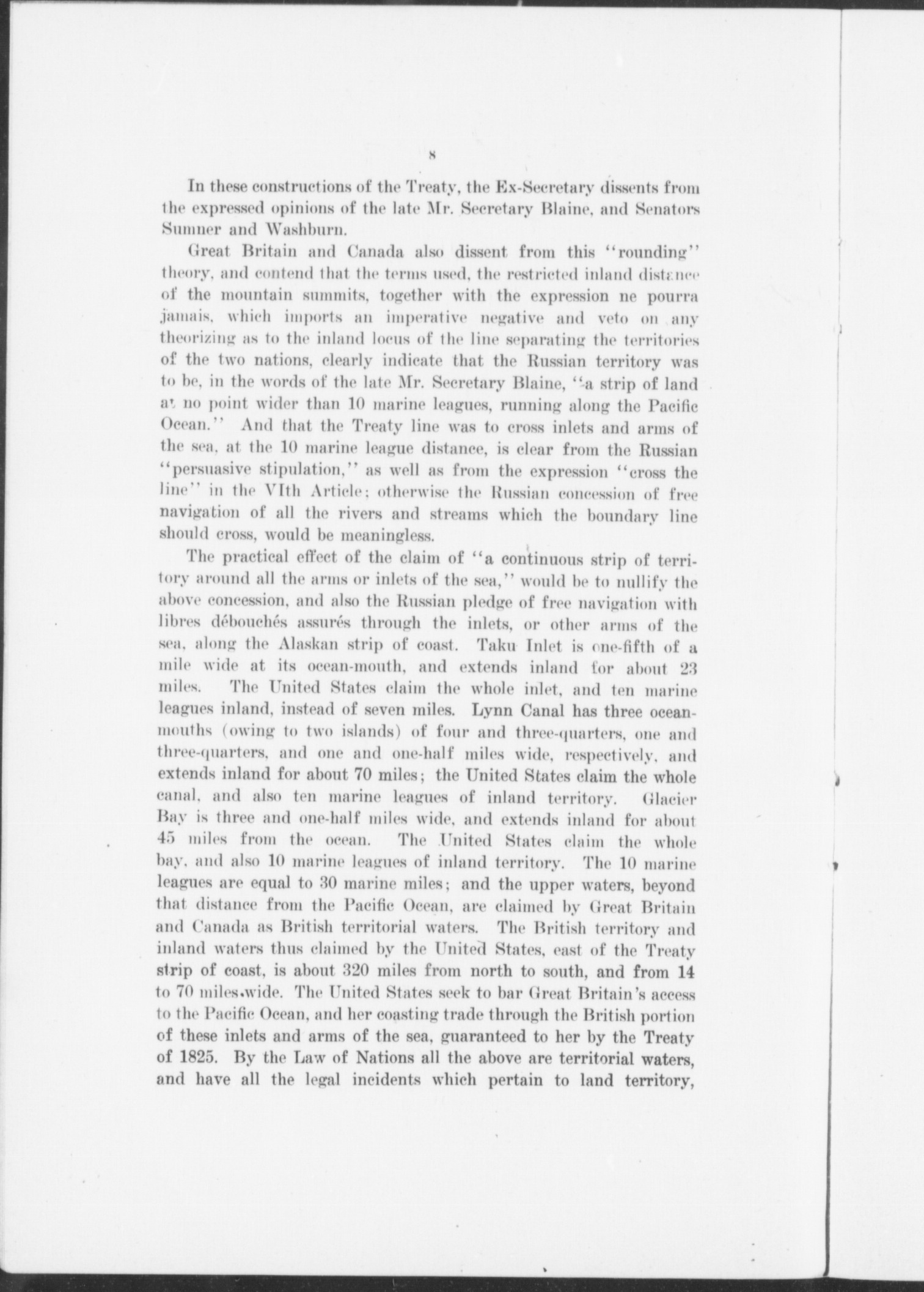 '"A strip of land ... was assigned to Russia ... the same strip of land which the United States acquired ... the same strip of land which gave to British America .. a free access to the ocean"-Mr. Secretary Blaine to the British Ambassador, 1890.'