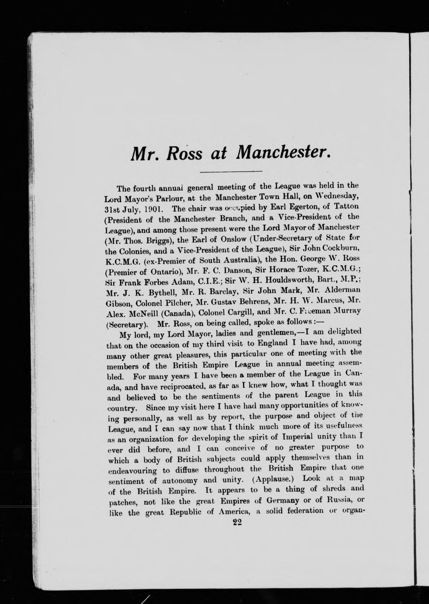 - Addresses delivered by Hon. G.W. Ross during his recent visit to England and at the meeting on his return.