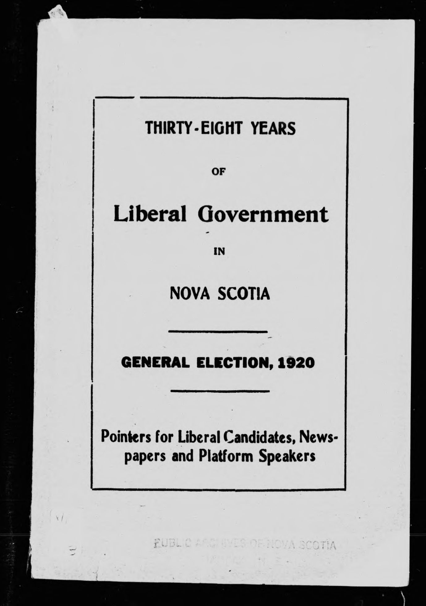 Thirty-eight years of Liberal government in Nova Scotia : general election, 1920, pointers for Liberal candidates, newspapers and platform speakers. - Adresse bibliographique