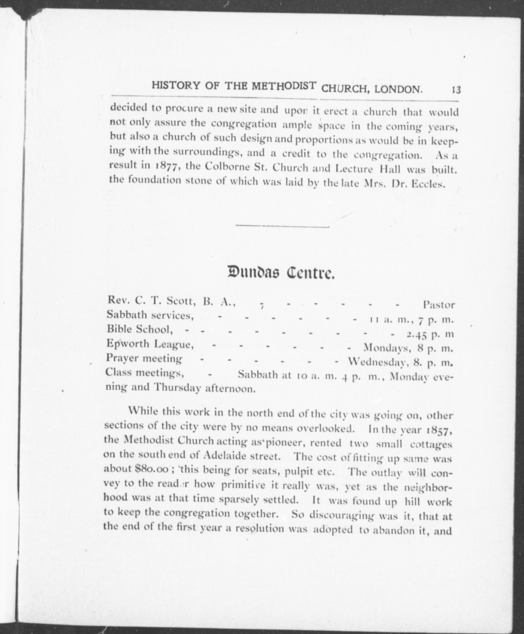 History of the Methodist Church in London, Canada from 1820 to 1905.