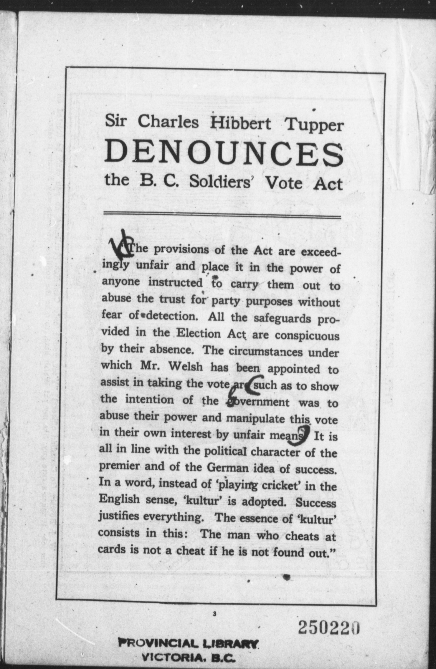 The soldiers' vote act of British Columbia ; Sir Charles Hibbert Tupper denounces conspiracy to manipulate votes ; "the Sun" analyzes legislation and exposes details of the plot. - Adresse bibliographique