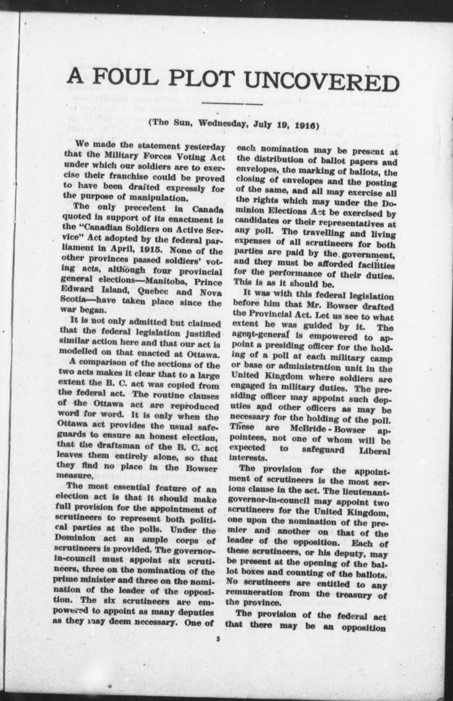 The soldiers' vote act of British Columbia ; Sir Charles Hibbert Tupper denounces conspiracy to manipulate votes ; "the Sun" analyzes legislation and exposes details of the plot.