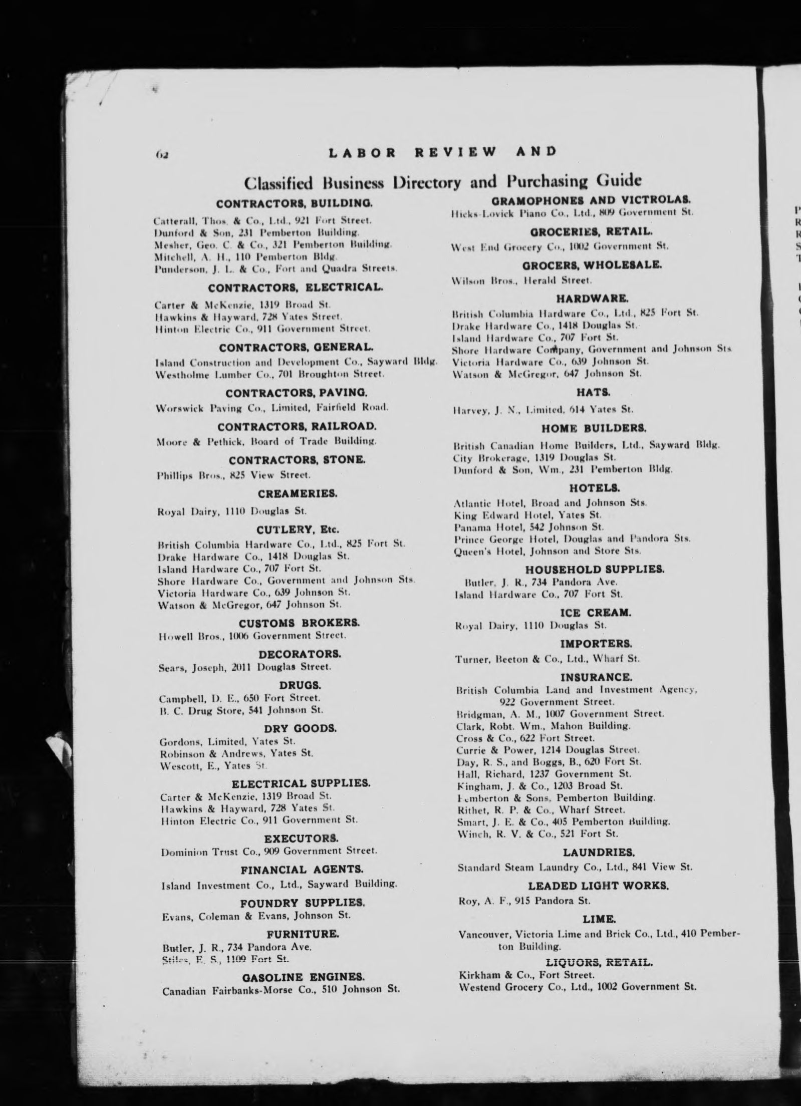 "Containing a history of the Victoria Trades and Labor Council, its aims and purposes, engravings of its officers, the Labor Temple ... the provincial labor laws ... a directory of the Victoria unions ... and a classified business directory and buyer's guide."