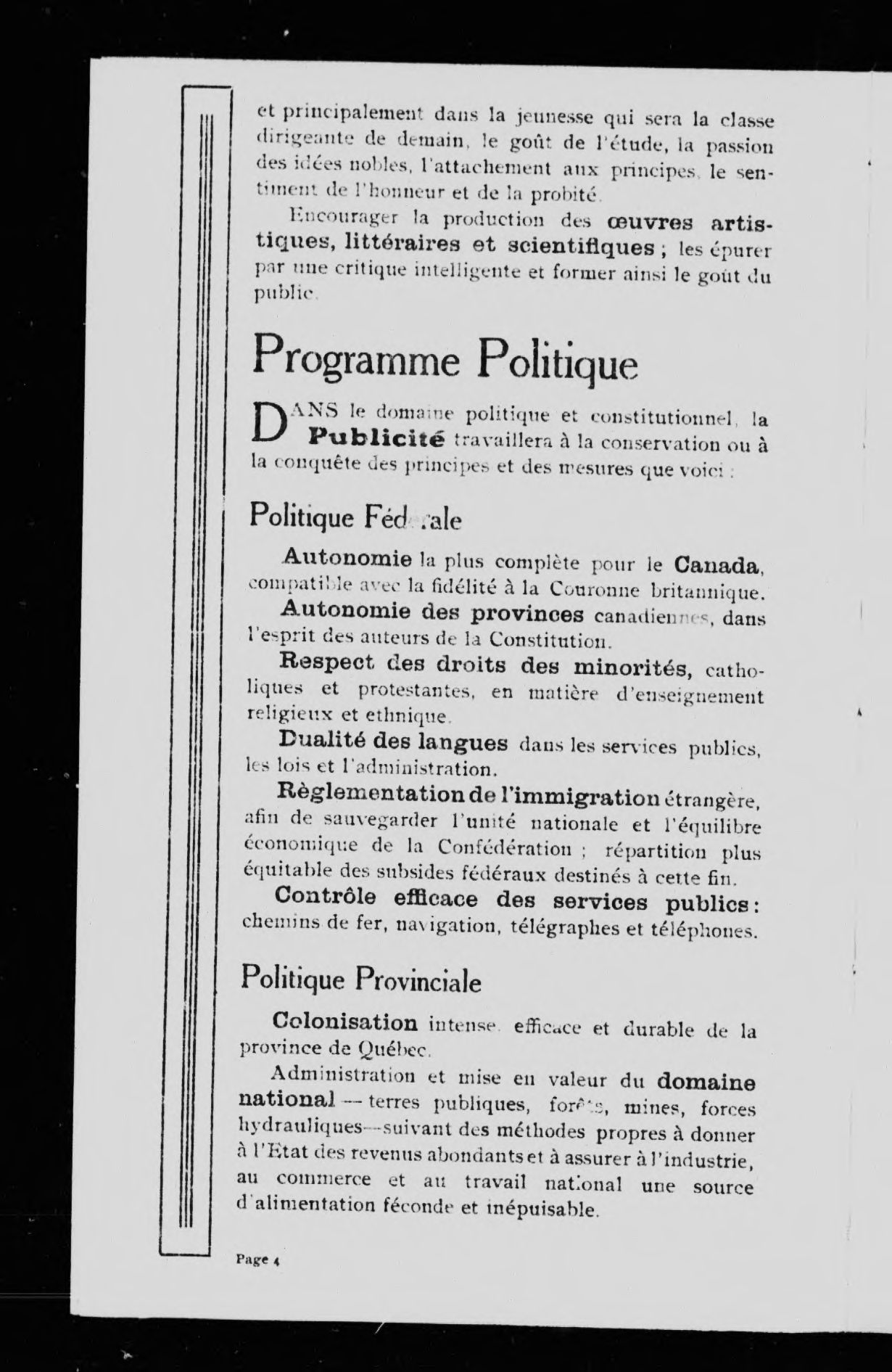 "Son object: le but de la Publicté est de promouvoir ... le progrès moral et matériel des Canadiens-Français."
