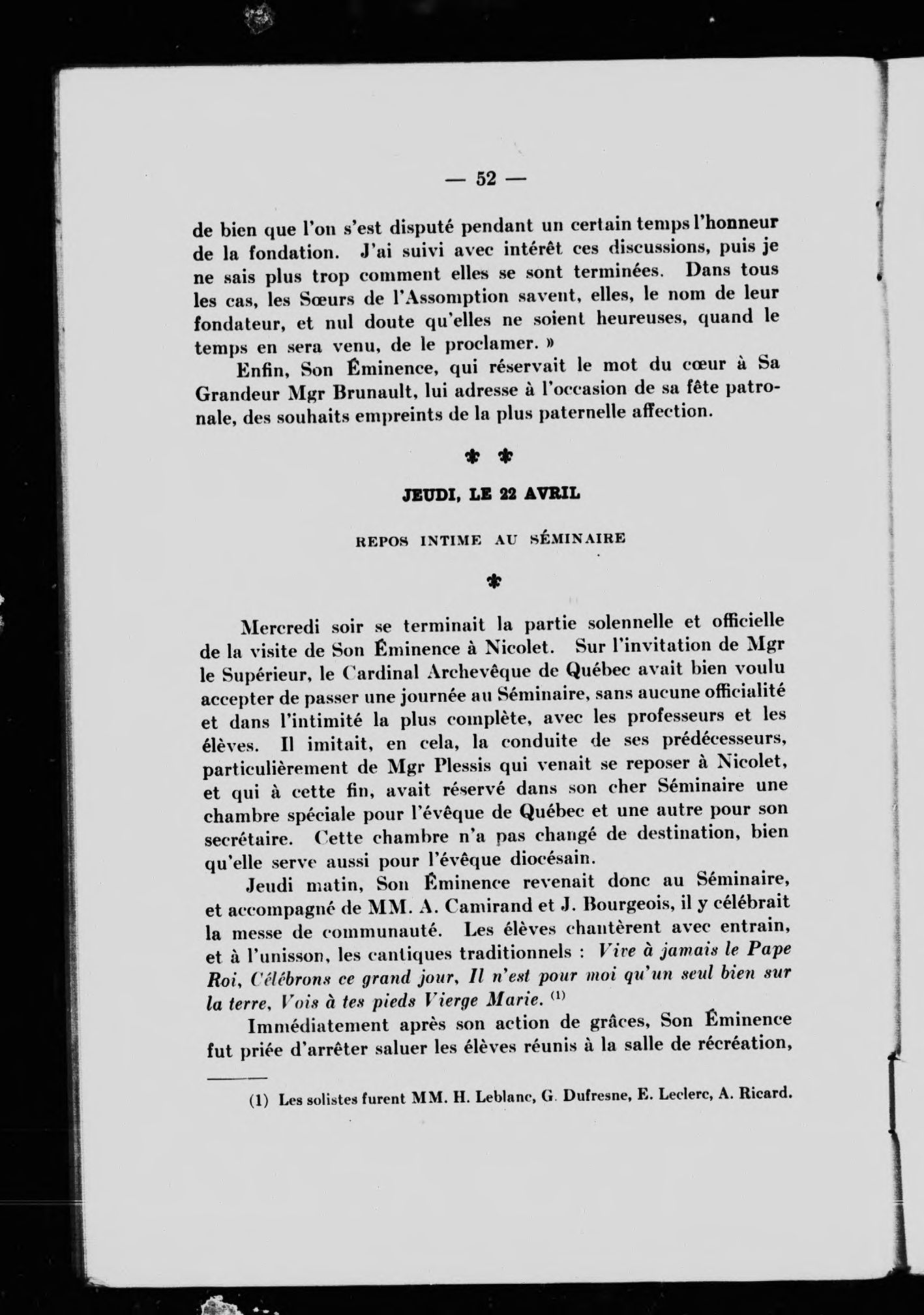 Visite de Son Éminence le cardinal Louis-Nazaire Bégin, archevêque de Québec, à Nicolet les 20, 21, 22, 23 avril 1915 :