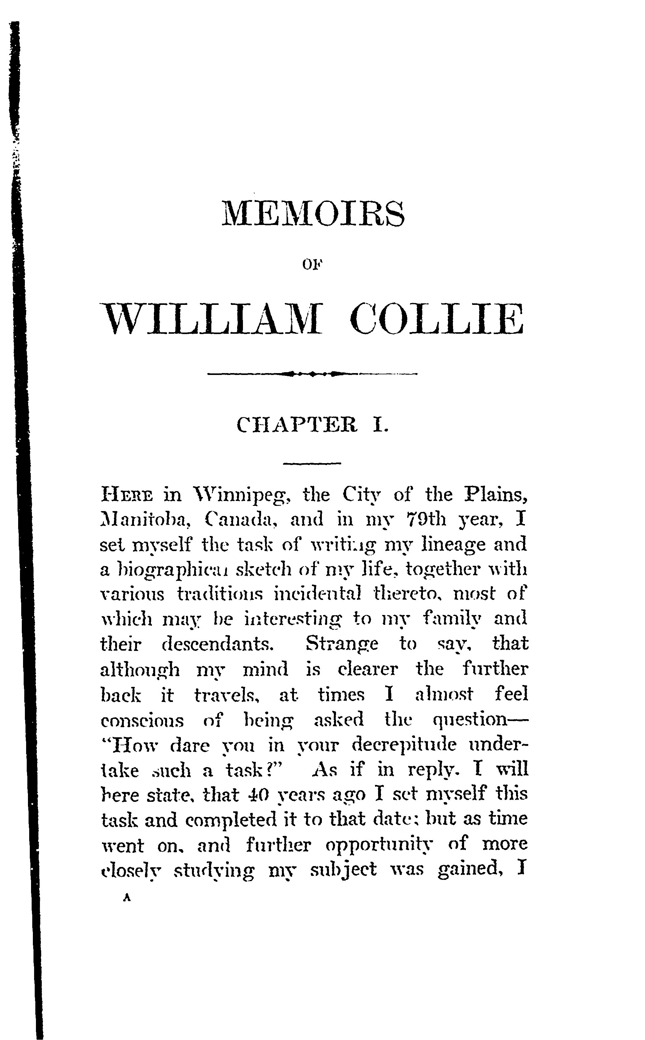 An autobiographical account of Collie's life in Scotland, Australia and Canada.Title from title screen."For private circulation.""In one volume."Includes appendix.