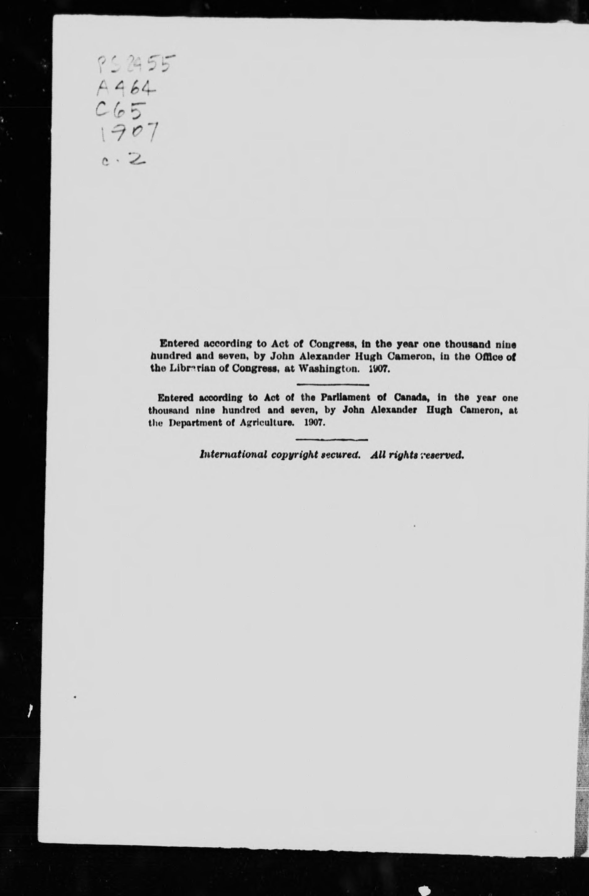 Cameron, John Alexander Hugh, b. 1878., author