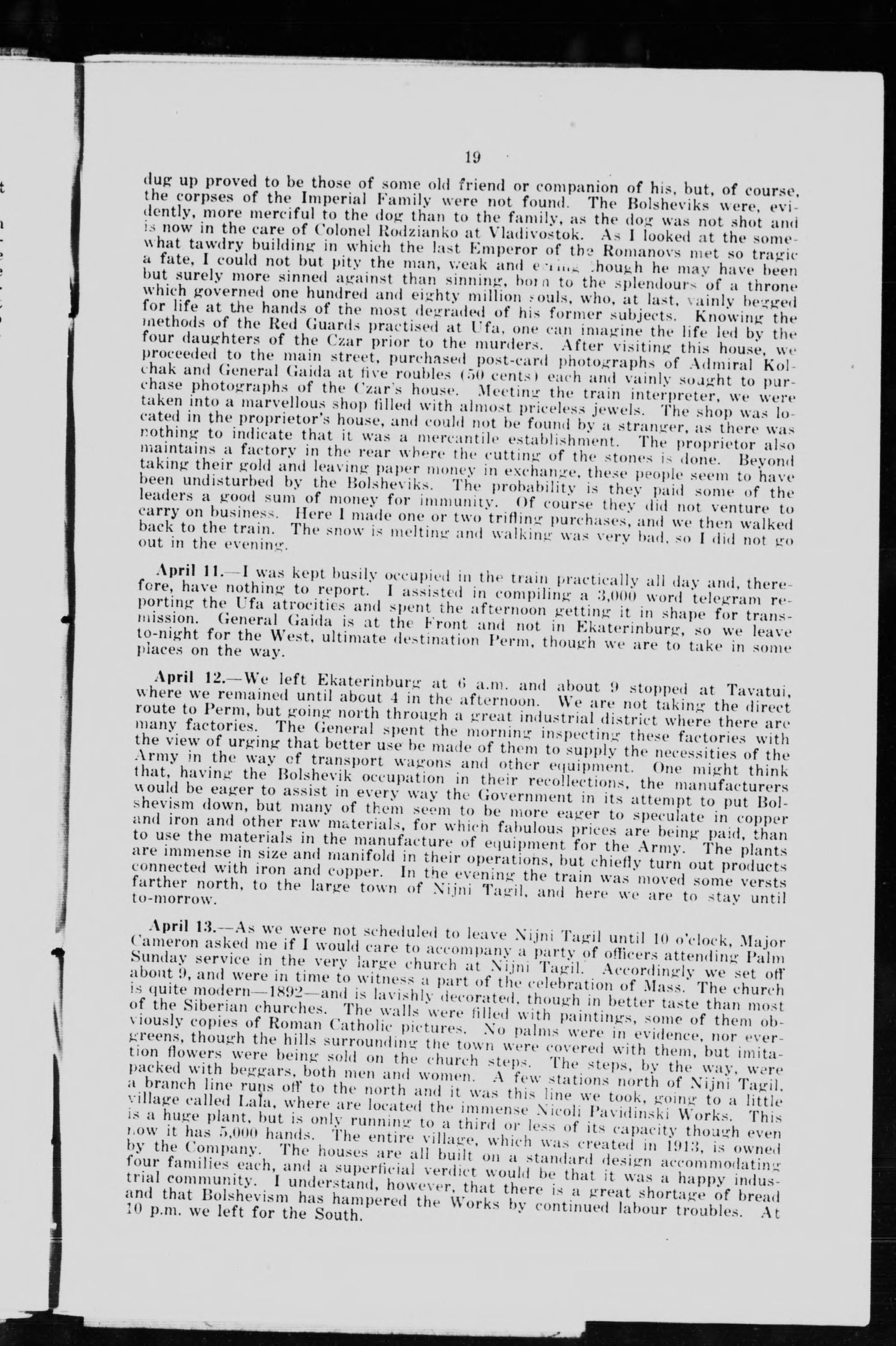 Diary of a member of the Canadian Siberian Expeditionary Force seconded to the British Military Misson under Major-General Alfred Knox, which records an expedition from Vladivostok to western Siberia during the allied intervention in the Russian civil war, March-April 1919.
