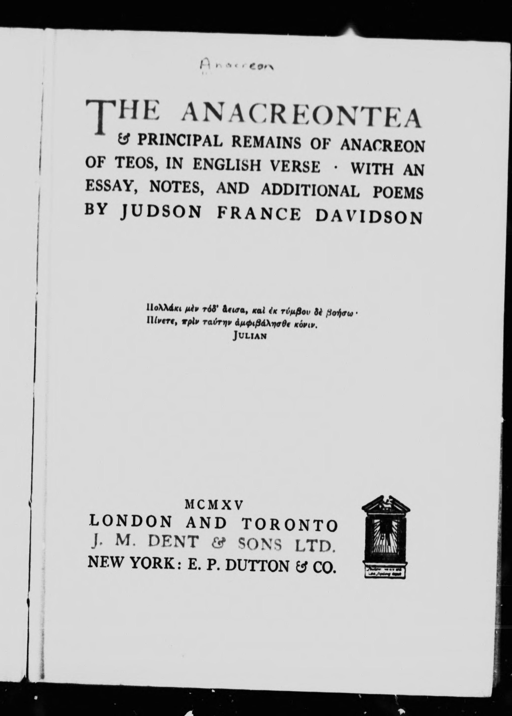 - The Anacreontes & principal remains of Anacreon of Teos, in English verse : with an essay, notes and additional poems