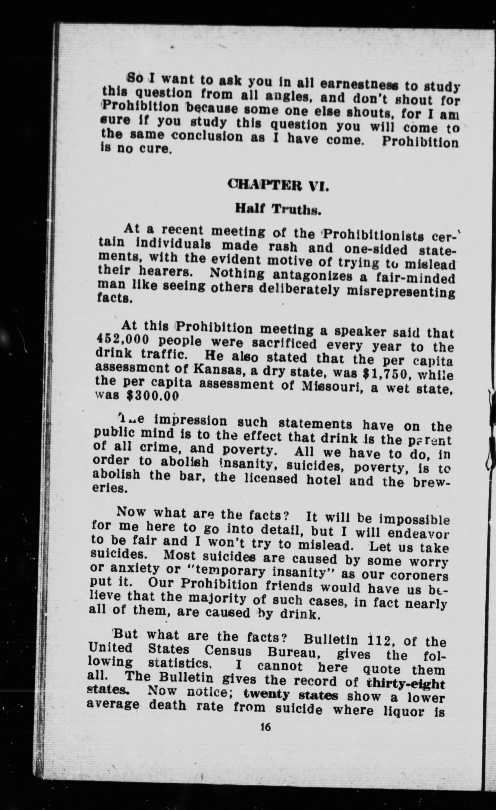 " ... I thought there was something wrong somewhere, and as I knew those Prohibition speakers got most of their data from the Anti-Saloon handbook for 1915 ..."--p. 20.