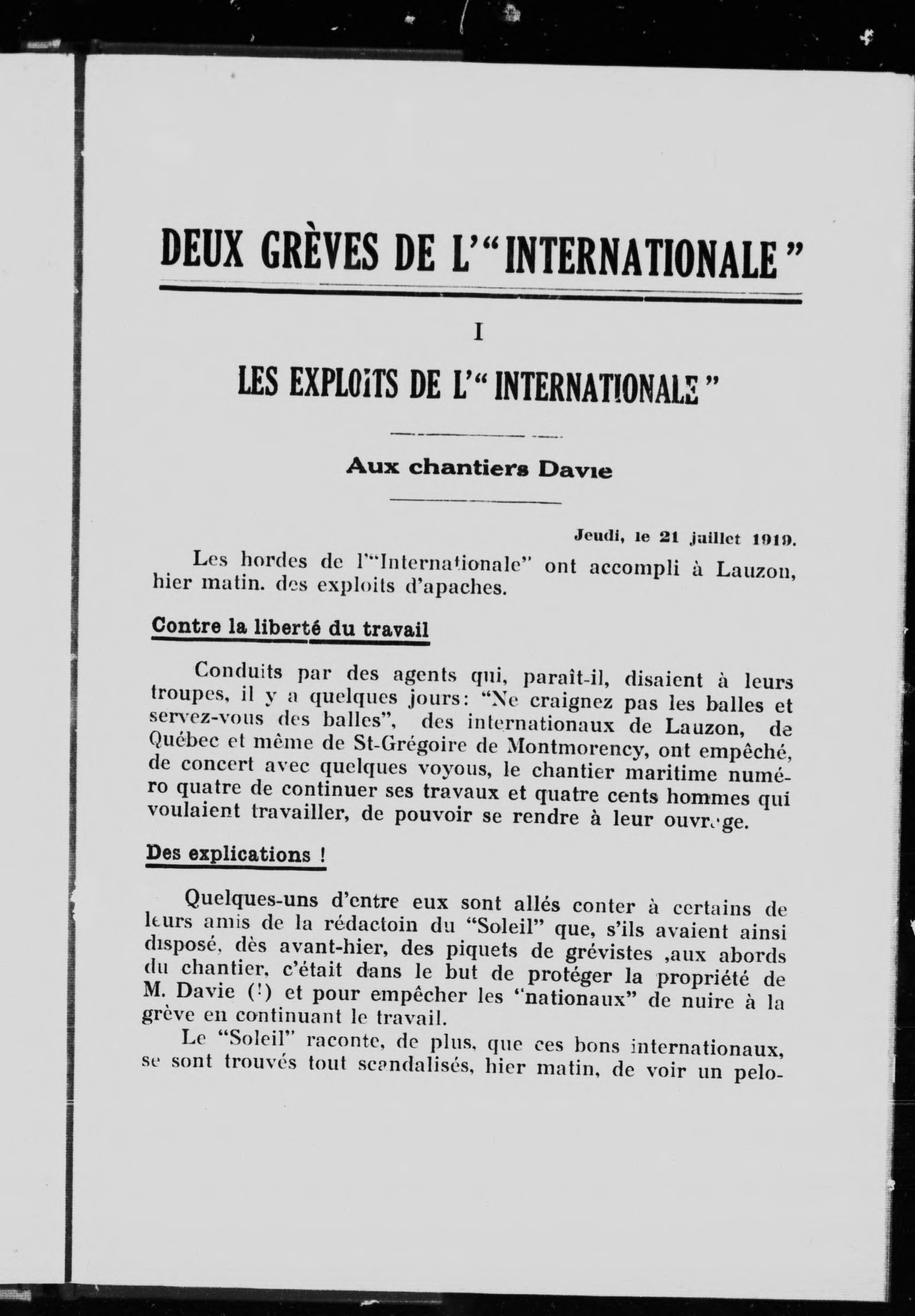 - Deux grèves de l'"Internationale" : aux chantiers Davie et à la Dominion Textile.