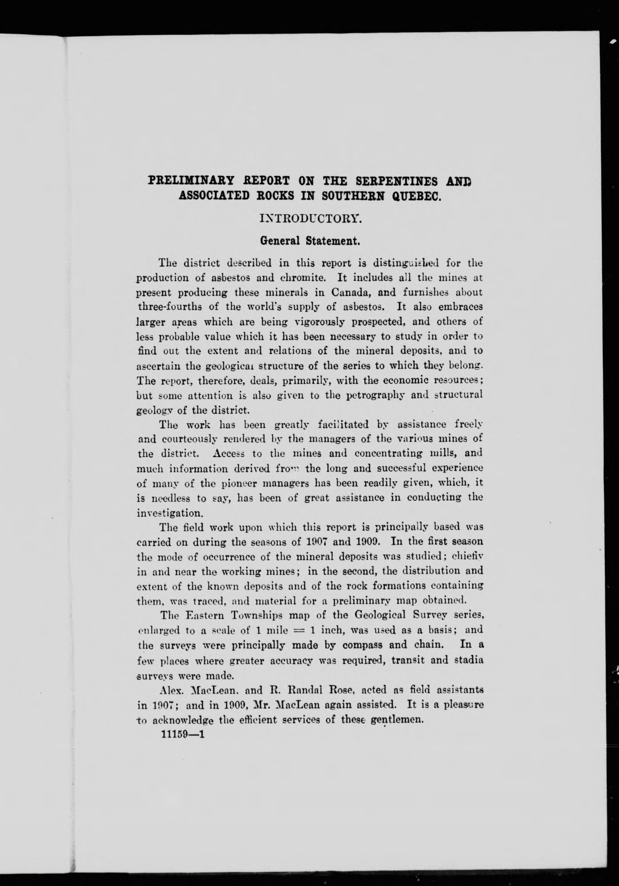 Preliminary report on the serpentine and associated rocks of southern Quebec /