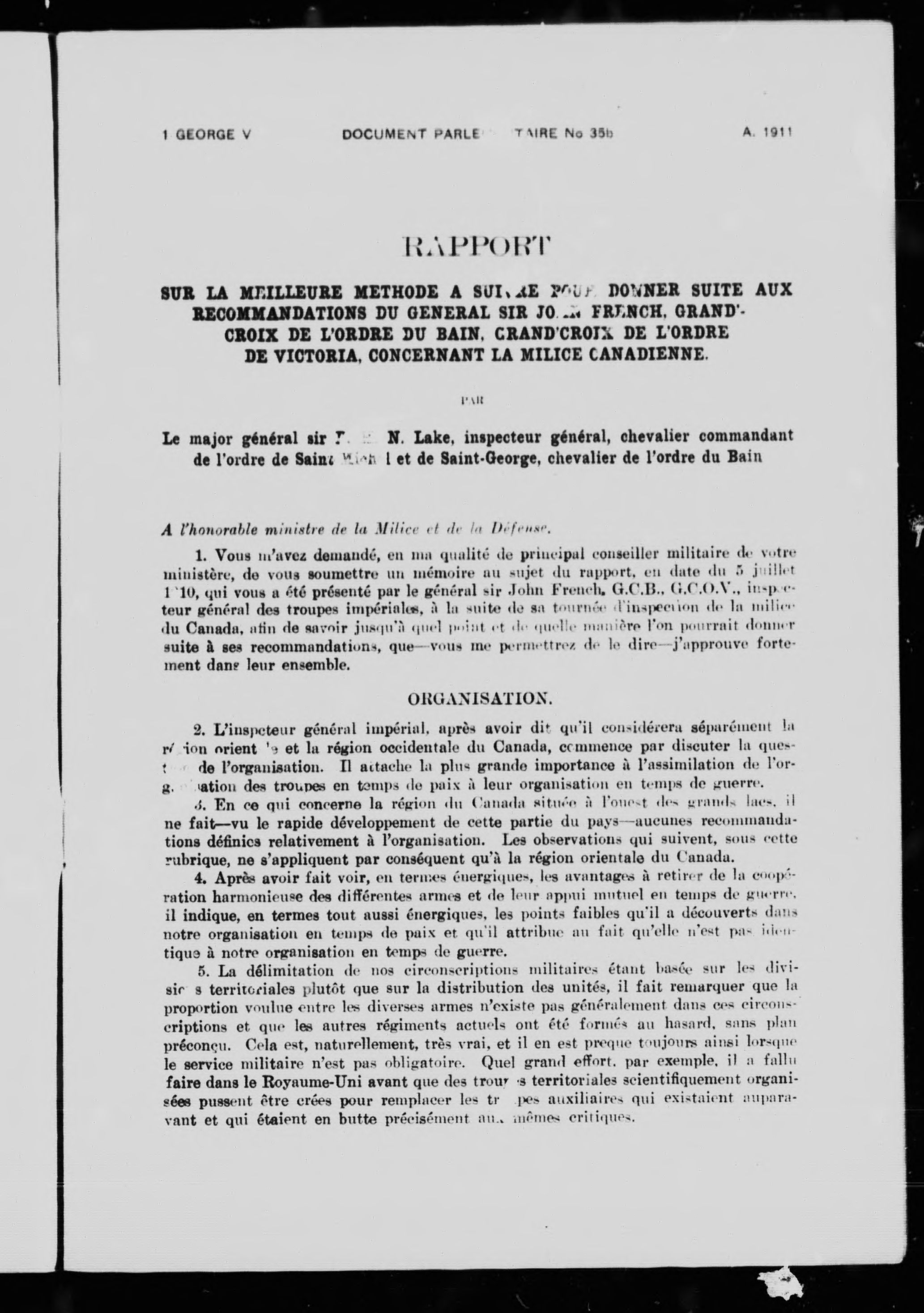 - Rapport sur la meilleure méthode à suivre pour donner suite aux recommandations du Général Sir John French ..., concernant la milice canadienne