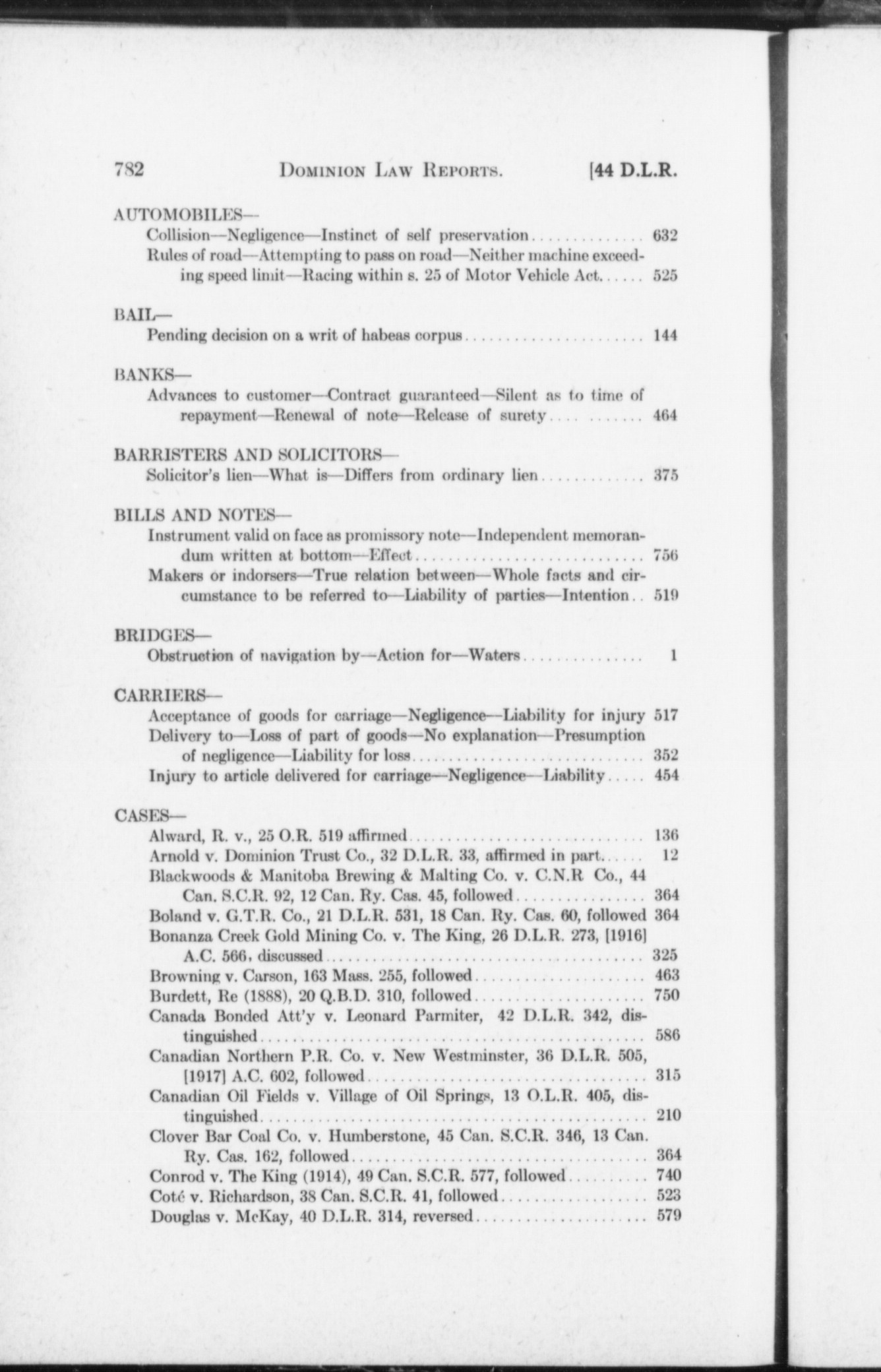 "For Alphabetically Arranged Table of Annotations to be found in Vols. I-XLIV, D.L.R., see Pages vii-xviii."