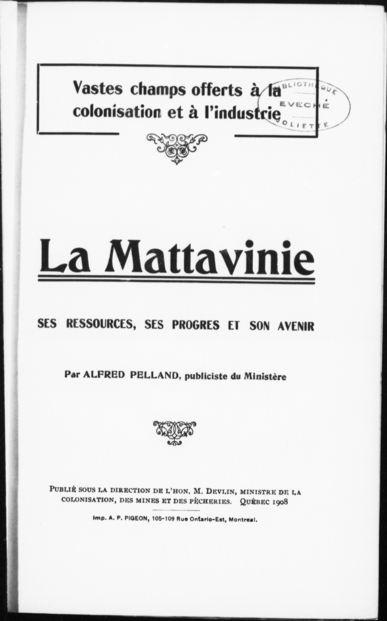 "Publié sous la direction de l'Hon. M. Devlin, Ministre de la colonisation, des mines et des pêcheries."|