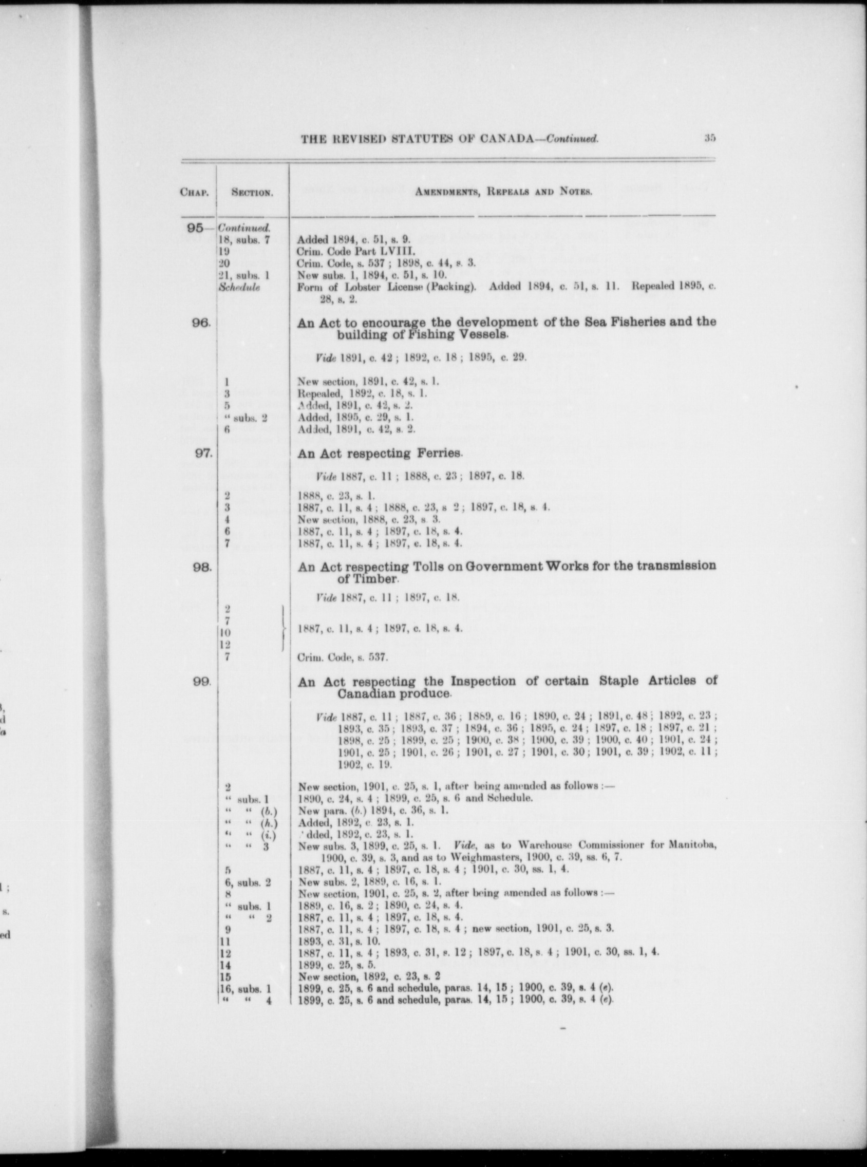 - Chronological table of the public general statutes of the Parliament of Canada : from the revised statutes, 1887 to the acts passed in the session of 1902, 2nd Edward VII., both inclusive : showing which of them, or what parts of them, are in force on July 1, 1902, and by what legislation each of them, since being passed, has been affected