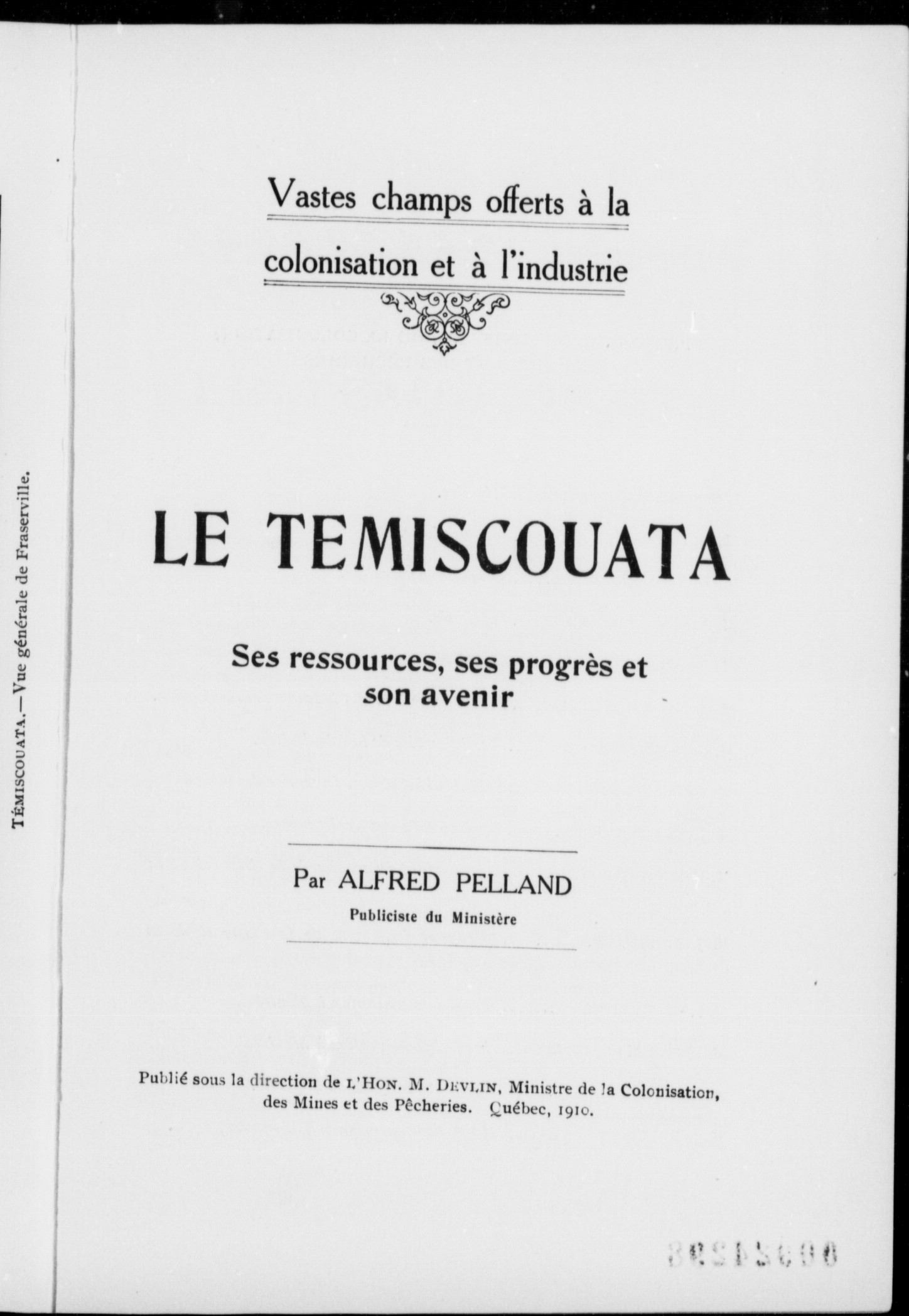 "Publié sous la direction de l'Hon. M. Devlin, Ministre de la Colonisation, des Mines et des Pêcheries."|