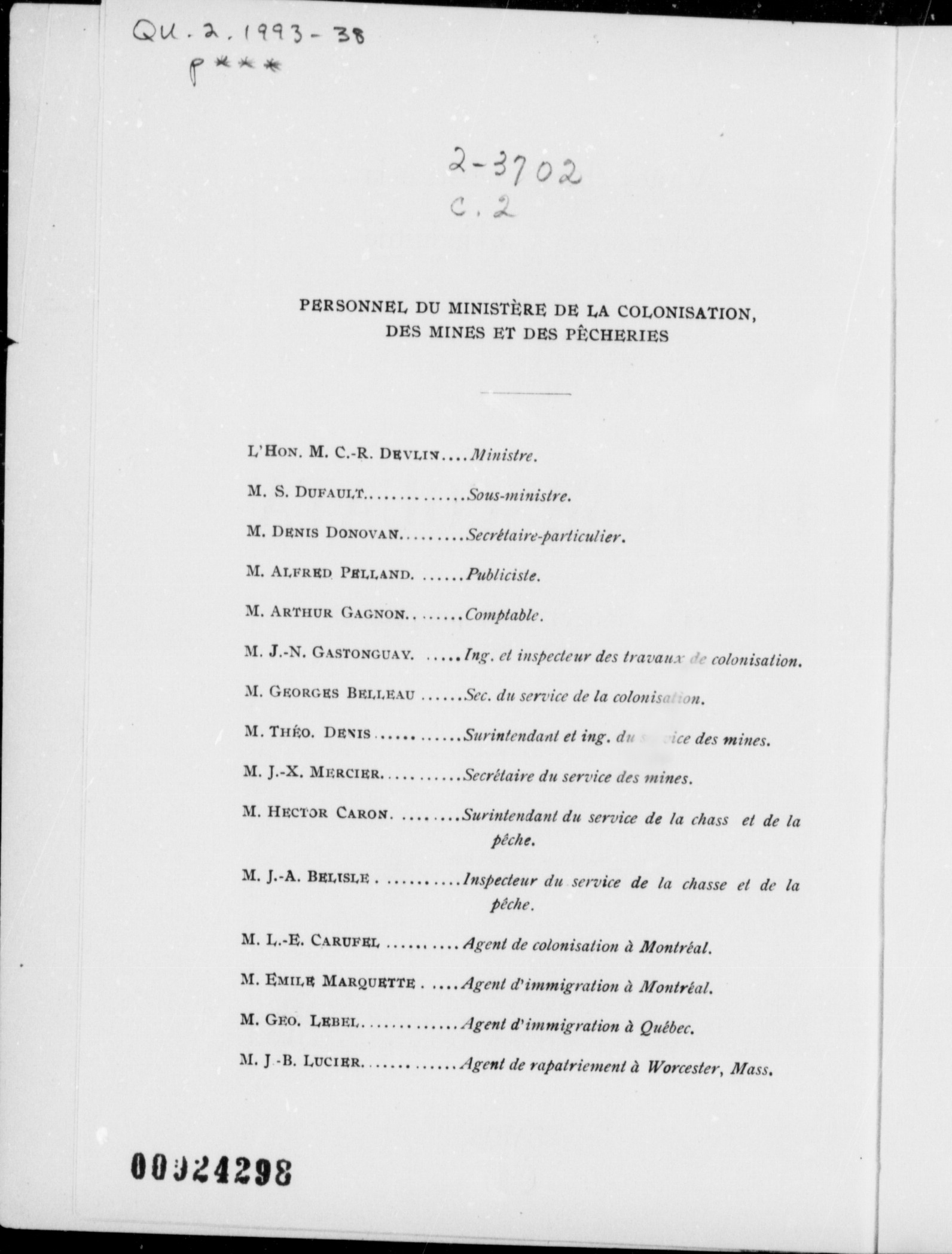 "Publié sous la direction de l'Hon. M. Devlin, Ministre de la Colonisation, des Mines et des Pêcheries."|