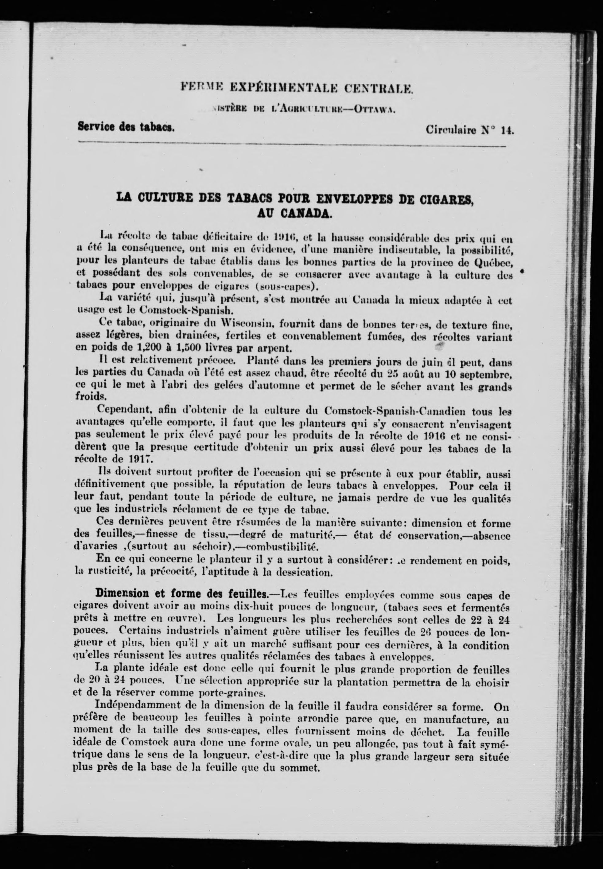 La culture des tabacs pour enveloppes de cigares, au Canada - Published