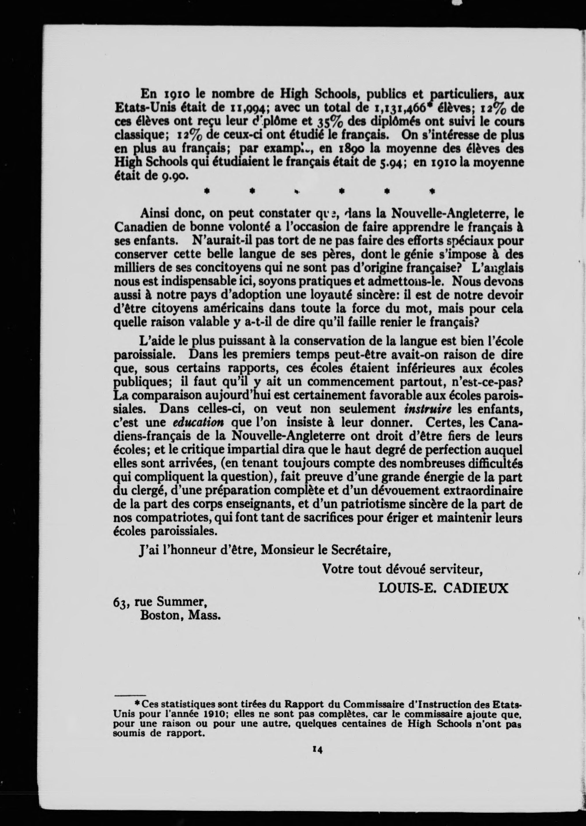 - L'enseignement du français dans les centres canadiens-français de la Nouvelle-Angleterre : mémoire de Louis-É. Cadieux au premier congrès de la Société du parler français, Québec, juin 1912.