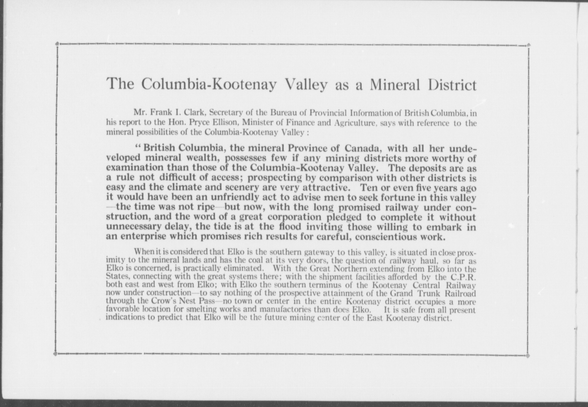 Elko, B.C., the southern gateway to the great Columbia, Kootenay Valley : Authentic Views & Facts of Elko's Developments & Prospects - Published