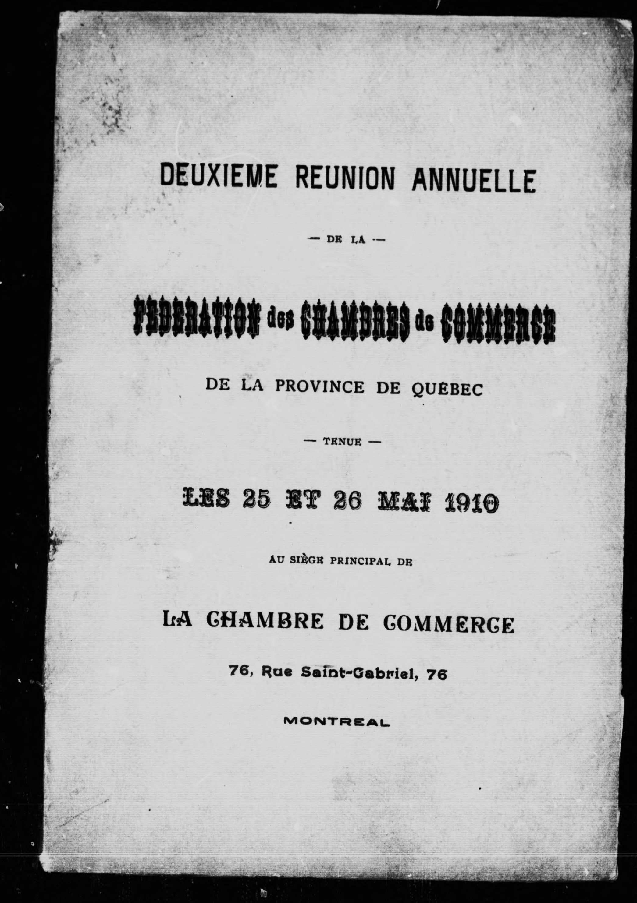Deuxième réunion de la Fédération des Chambres de commerce de la province de Québec : tenue les 25 et 26 mai 1910 au siège principal de la Chambre de commerce du district de Montréal ... - Adresse bibliographique
