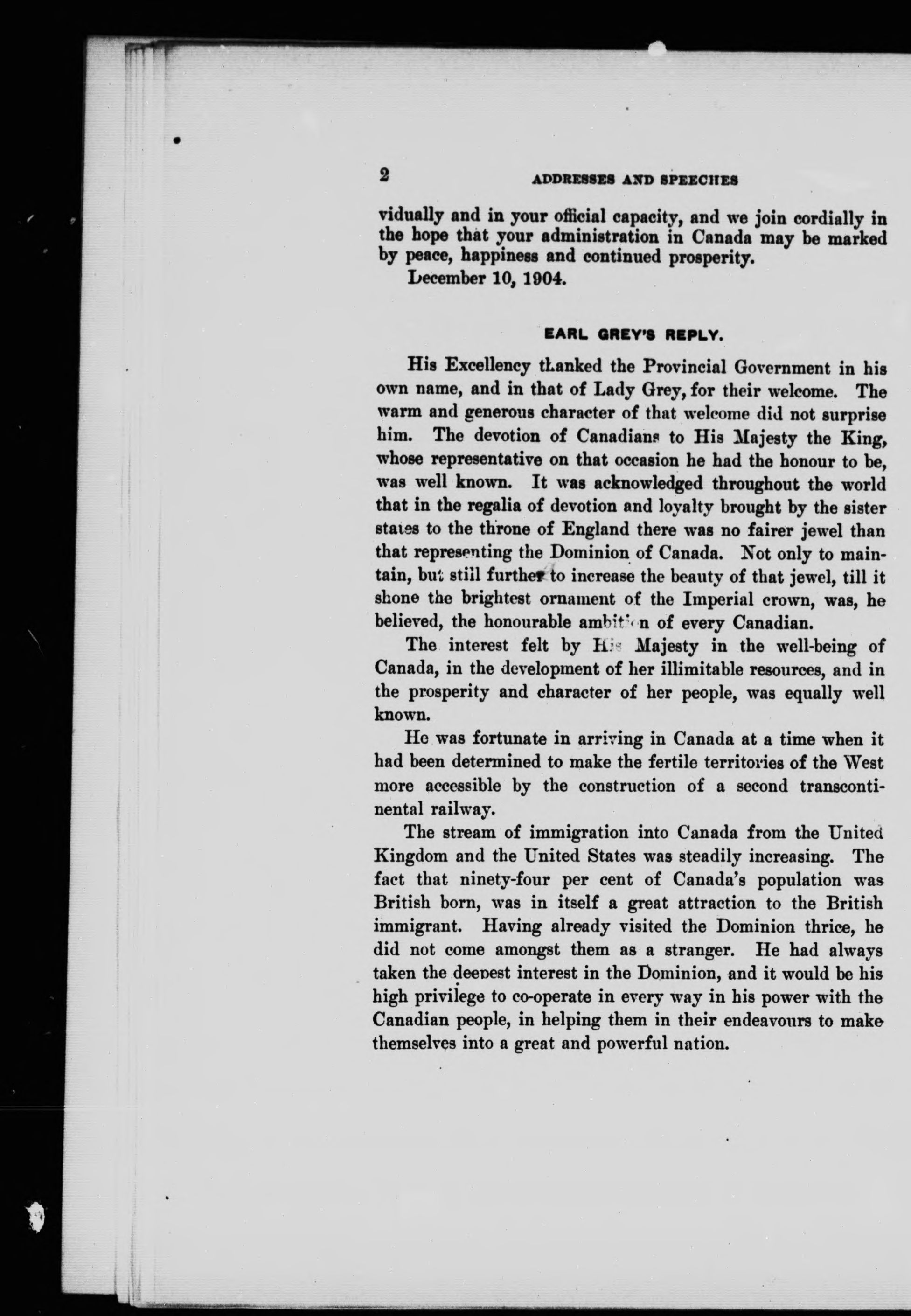 - Addresses to His Excellency Earl Grey, G.C.M.G., etc., Governor General of Canada, and his speeches in reply having relation to the resources and progress of the Dominion