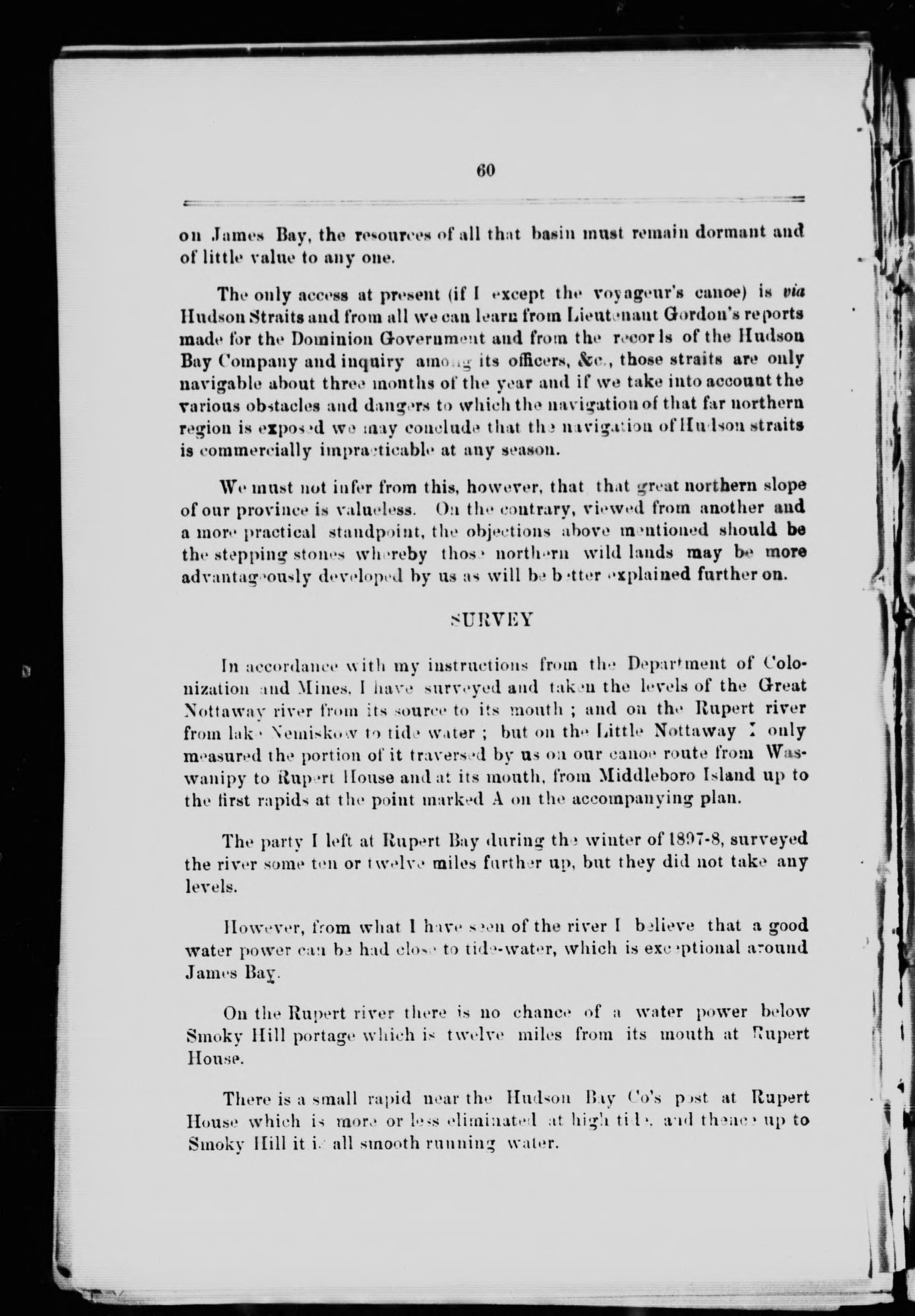 Second report of progress of exploration in the country between Lake St. John and James Bay : including the region of Lake Mistassini and the basins of the great Nottaway and Rupert rivers : together with a key plan to accompany remarks on the different proposed railways between Quebec and James Bay : made under instructions from the Department of Colonization and Mines, Quebec - Adresse bibliographique
