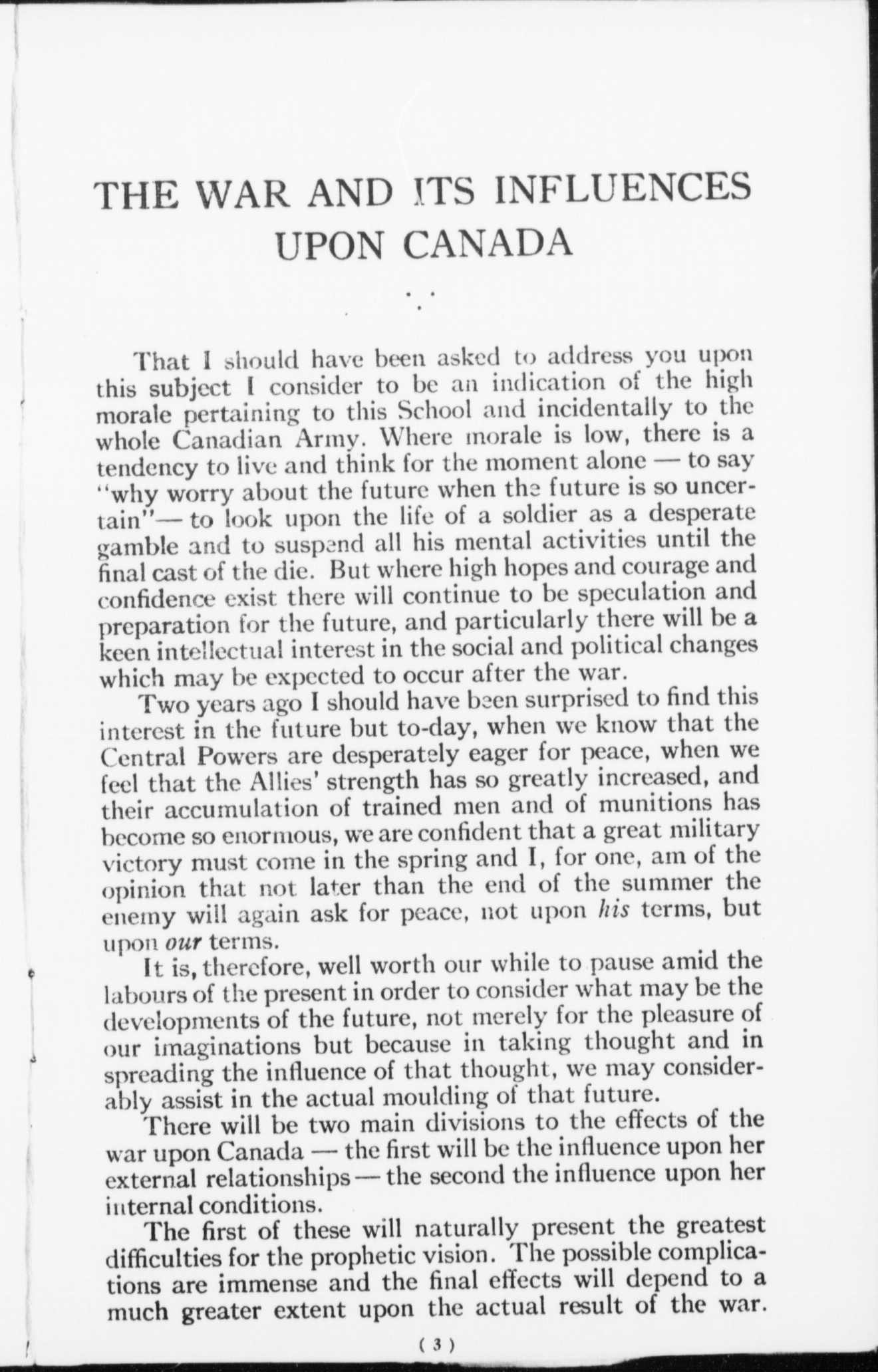- The war and its influences upon Canada : address delivered by the late Major Talbot Papineau, M.C., to the Canadian Corps School at Pernes in February, 1917.