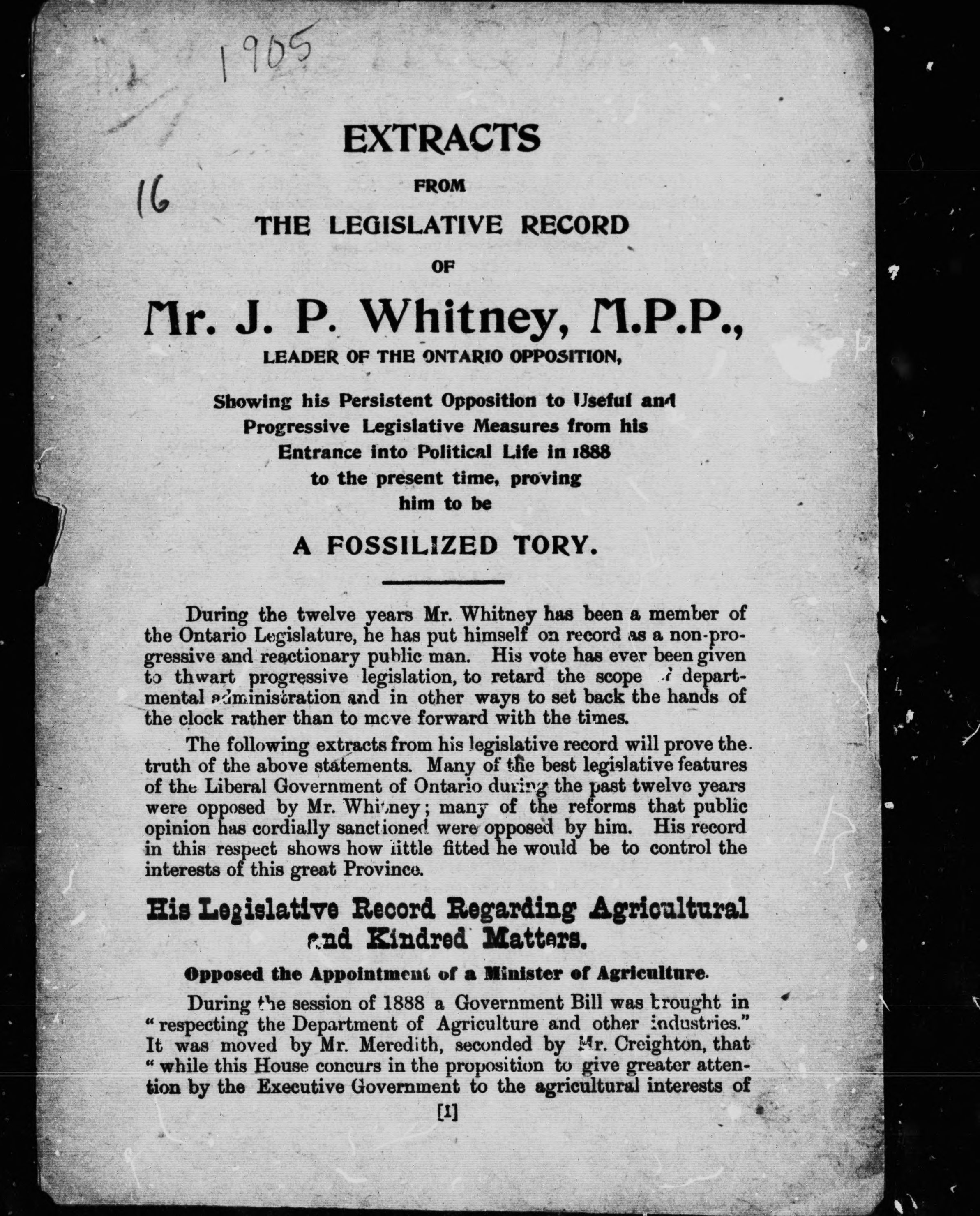 - Extracts from the legislative record of Mr. J.P. Whitney, M.P.P., leader of the Ontario Opposition, showing his persistent opposition to useful and progressive legislative measures from his entrance into political life in 1888 to the present time, proving him to be a fossilized Tory.
