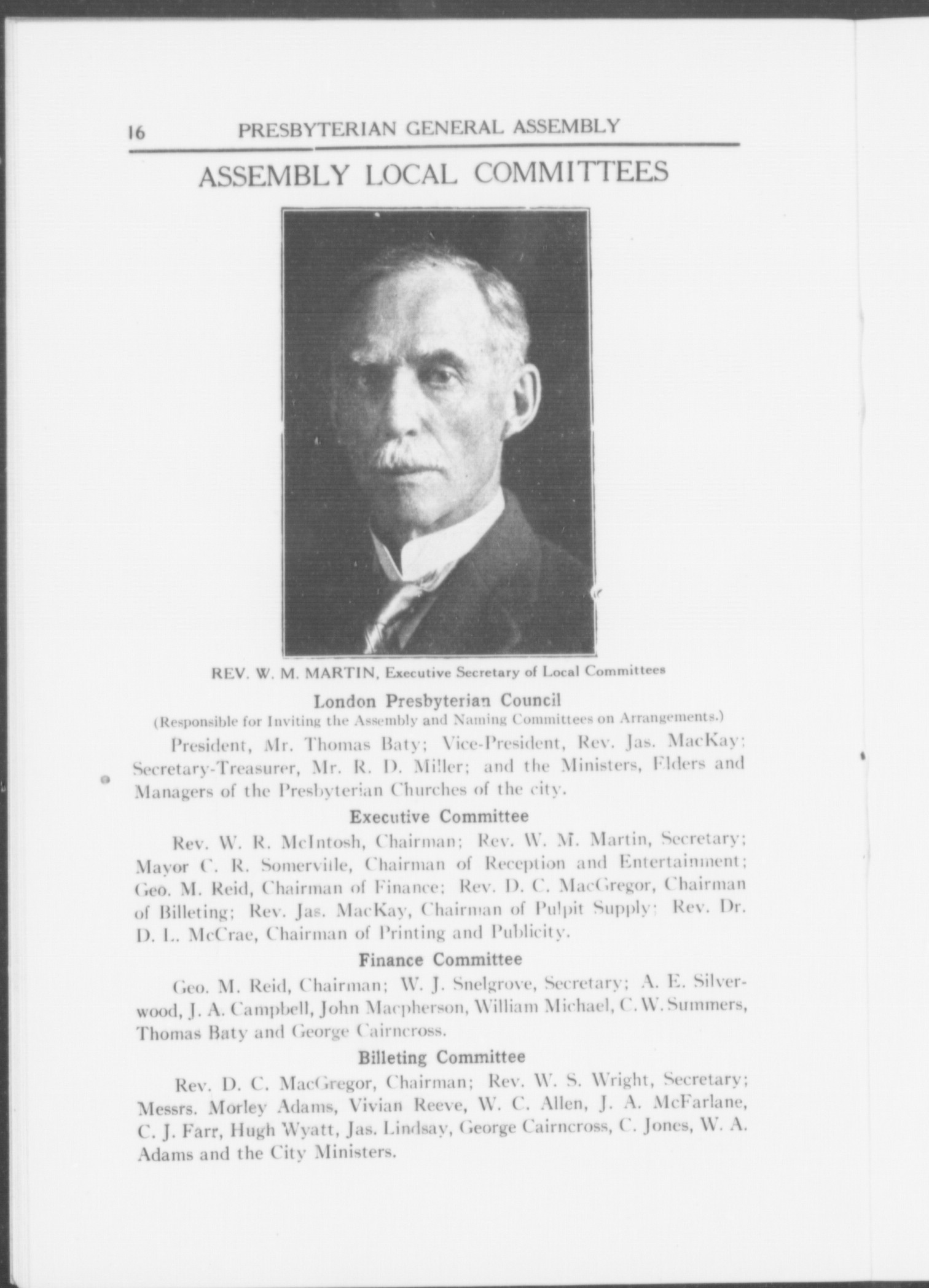 Presbyterian General Assembly, historical sketch, useful information, local committees, billeting list : held in St. Andrew's Church, London, Canada, Wednesday, June 5 to Thursday, June 13, 1918.