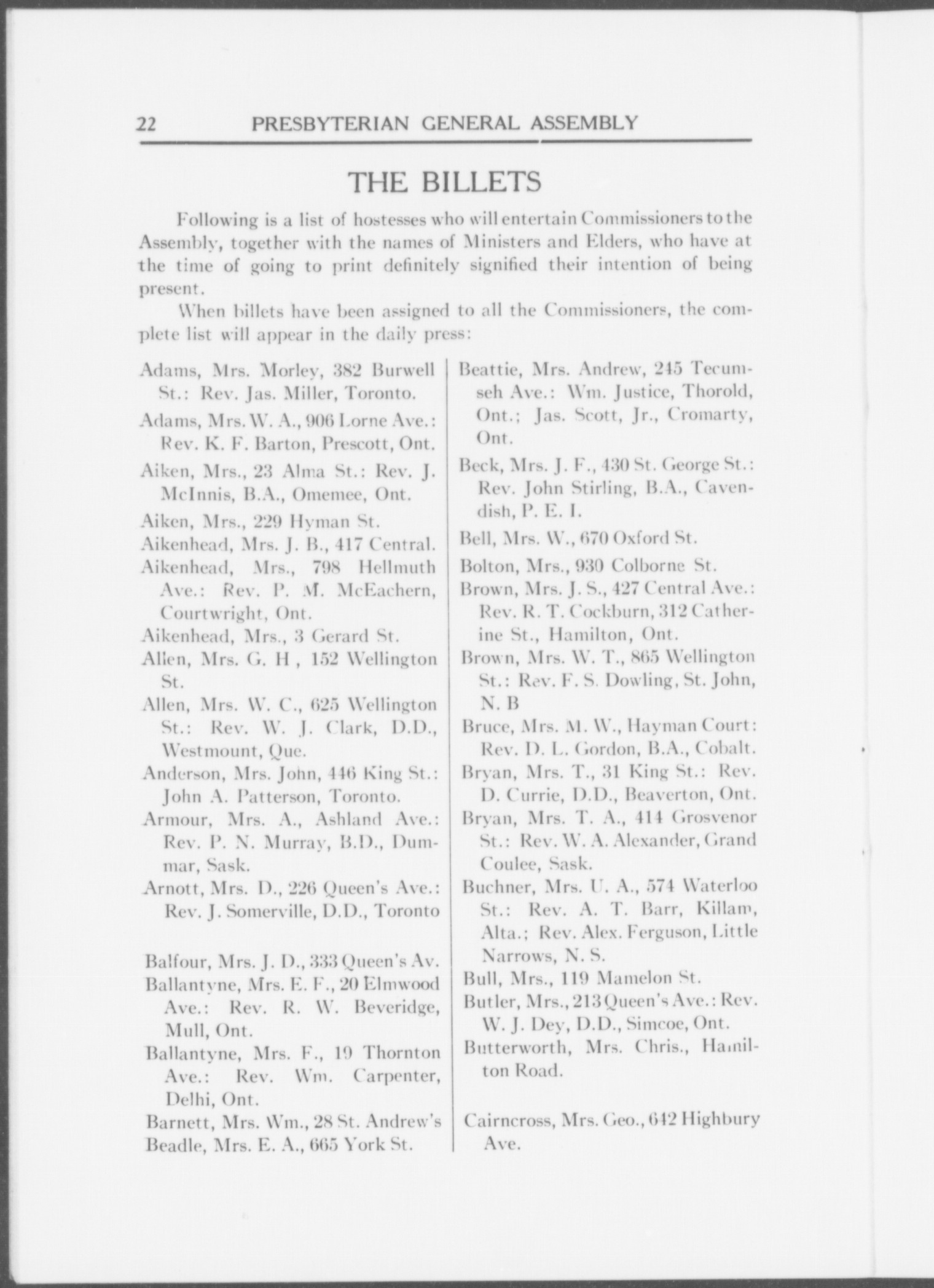 Presbyterian General Assembly, historical sketch, useful information, local committees, billeting list :