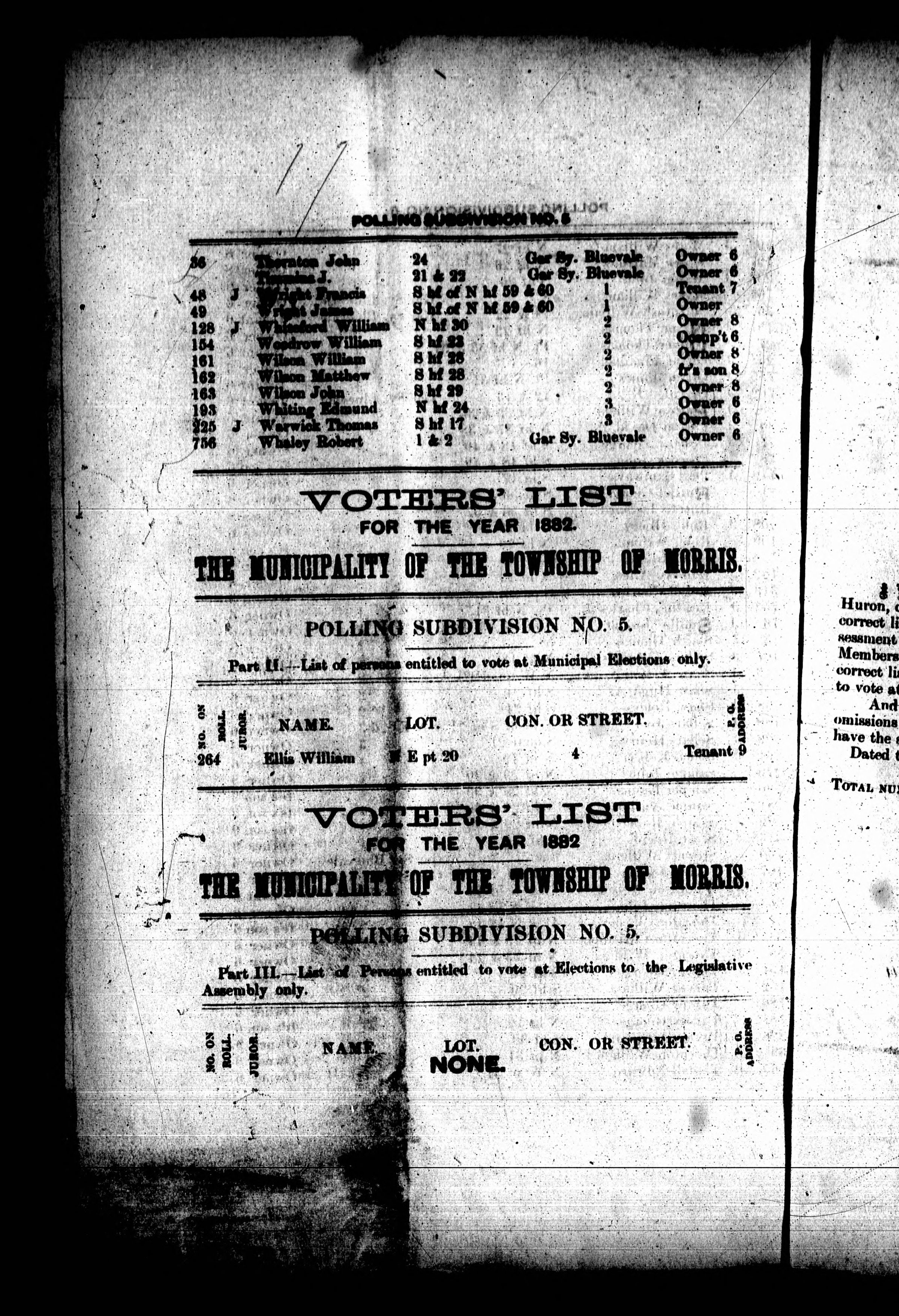 - Voters' list for the year 1882, Morris Township, county of Huron : list of persons entitled to vote at municipal elections and elections to the Legislative Assembly.