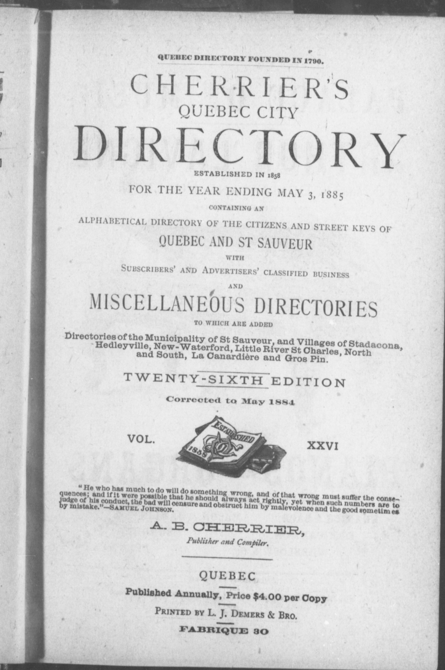 Quebec : A.B. Cherrier, Publisher and Compiler, [1884?]; 470 images avec recherche en texte intégral